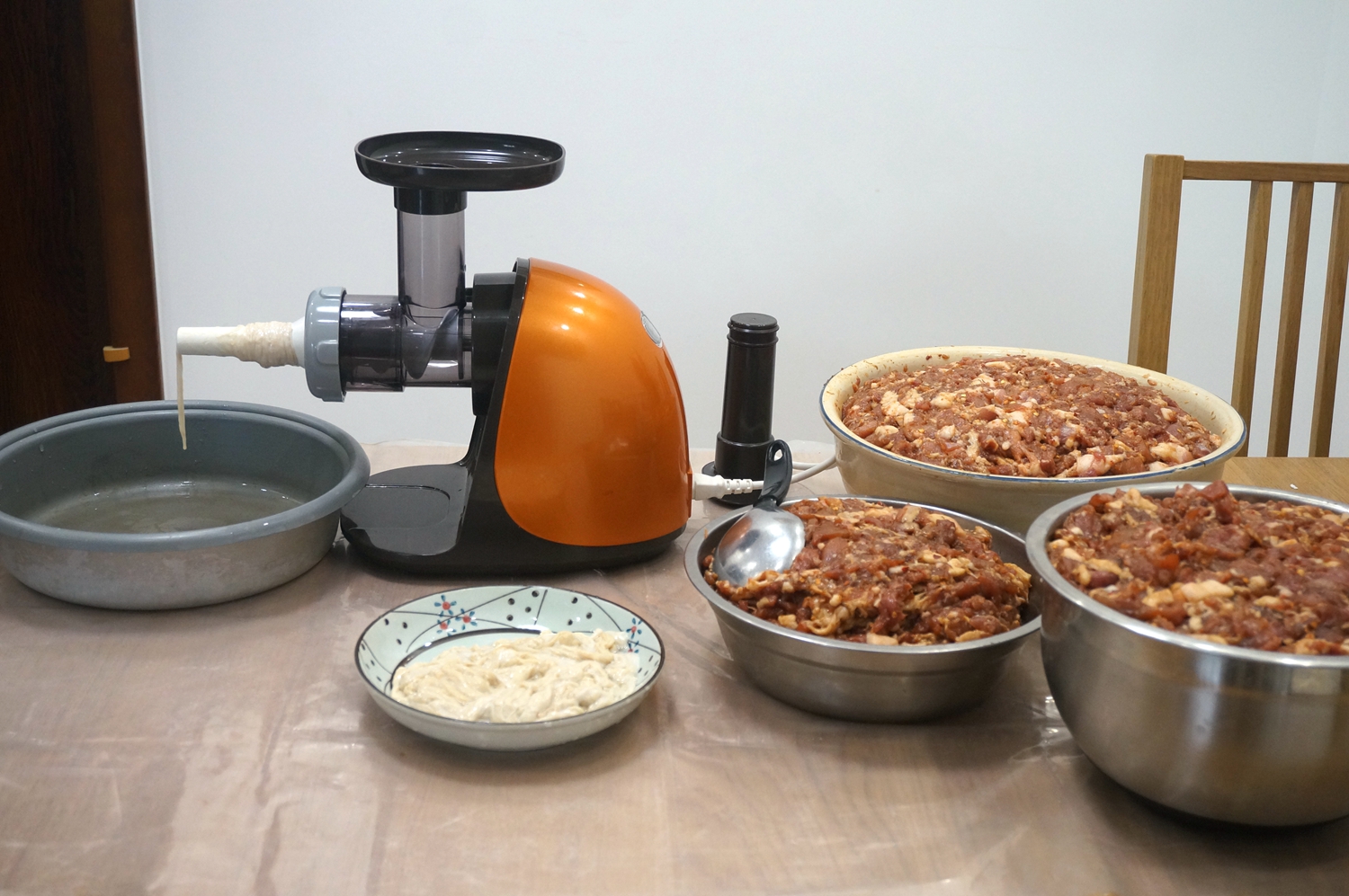 7. 看,25斤的肉全部腌好了,机器和肠衣也准备好,75岁老妈一人就能搞定,但,我怎么能忍心让老人家一人干呢?人多力量大,一会儿就能做好;http://si1.go2yd.com/get-image/0KAibdVhnxw