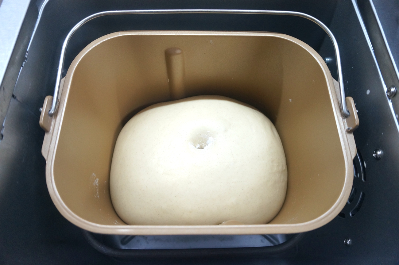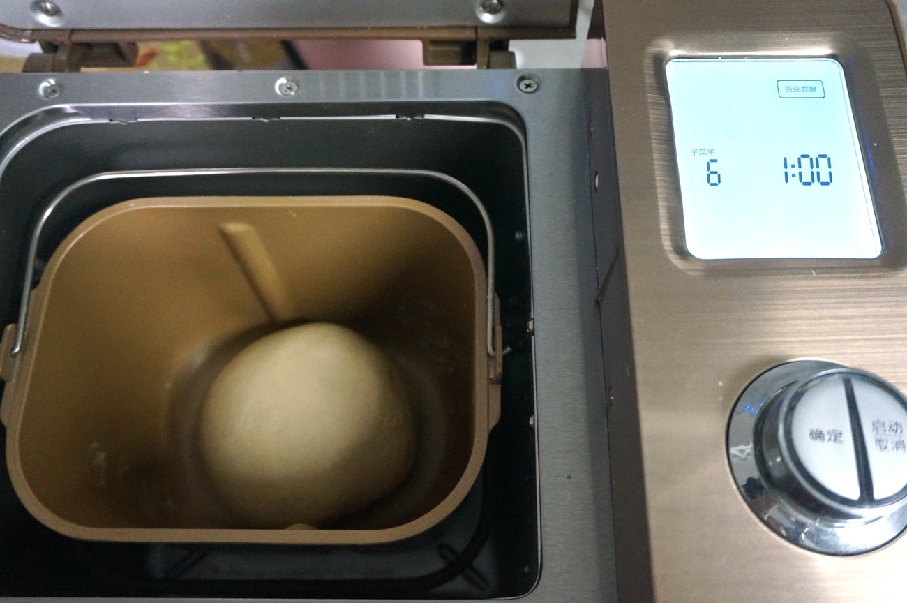 4. 将面团收圆,放在面包桶内,盖一块湿布防止表皮变干,启动发酵程序,时间暂定1小时,看面团涨发情况再调整;http://si1.go2yd.com/get-image/0KCTKx9SicC