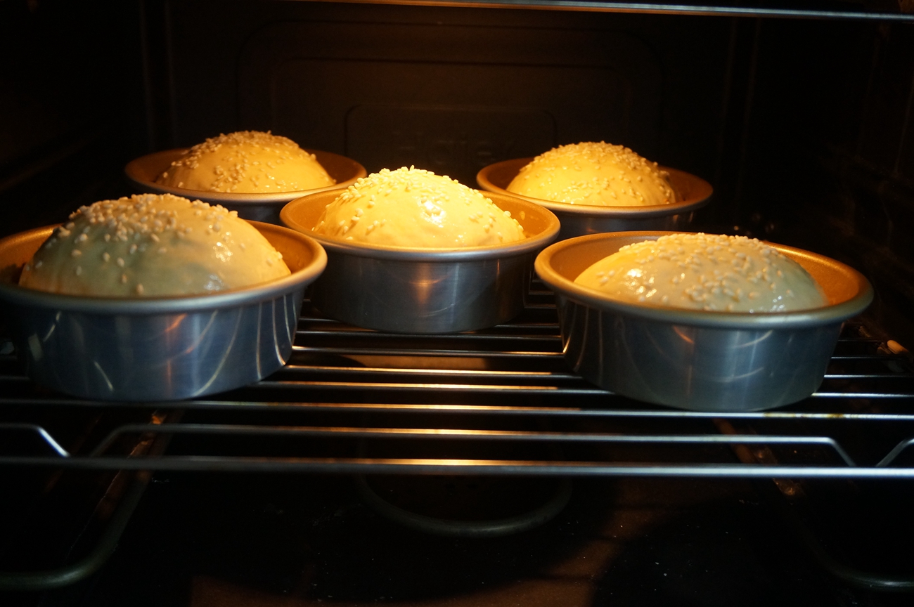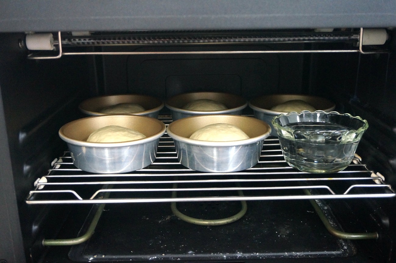 8. 将汉堡生坯放在温暖湿润处进行发酵;我直接放进烤箱中,放一碗水增加湿度,也没有设温度,让面团自然发起来;http://si1.go2yd.com/get-image/0KCTOhdthiK
