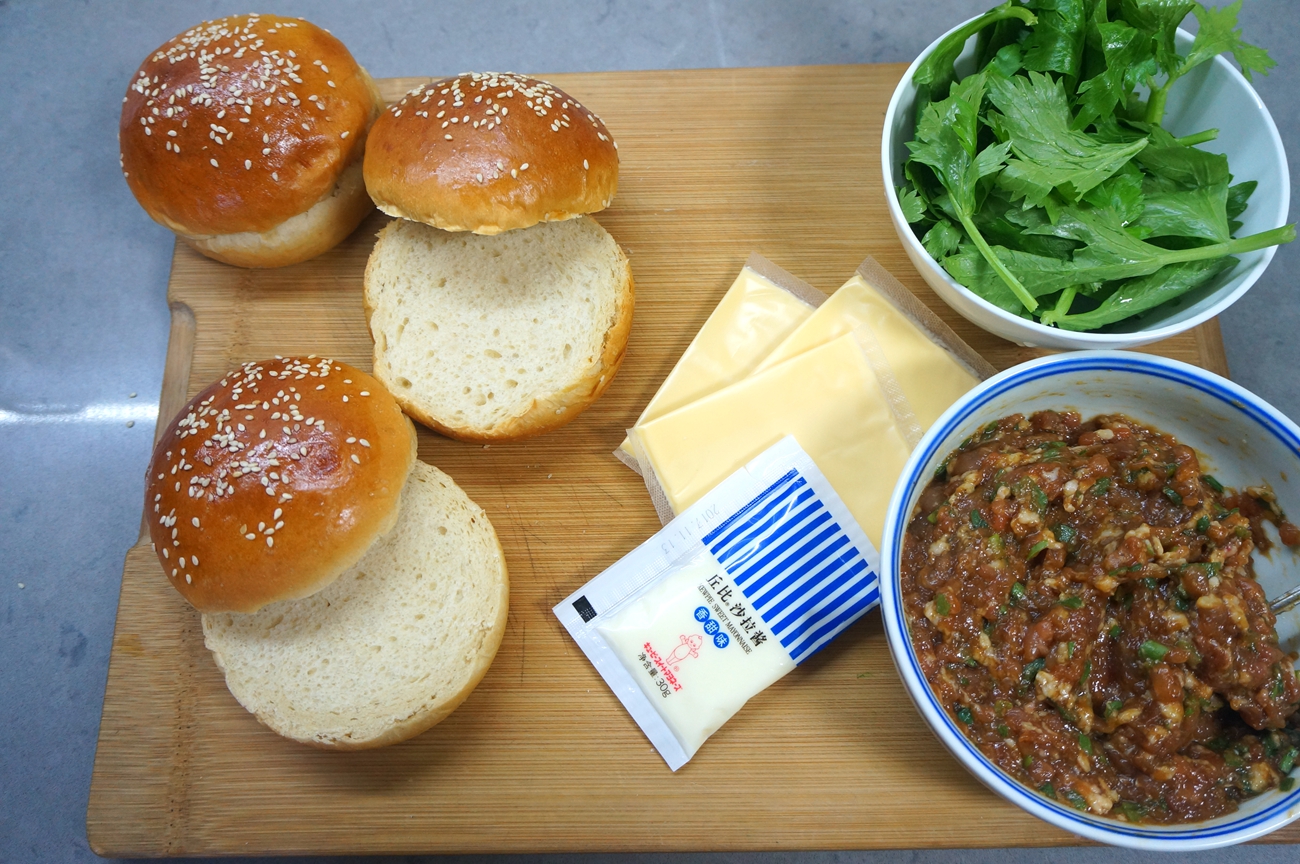 12. 将汉堡坯横着一分为二、再准备好自己喜欢的夹料,我要煎肉饼,所以调了一碗猪肉馅,里面放大葱、酱油、盐、蚝油、水黑胡椒粉、一小勺淀粉,奶酪片和青菜叶准备好,我用的芹菜叶,很清香;http://si1.go2yd.com/get-image/0KCTT67ORgu