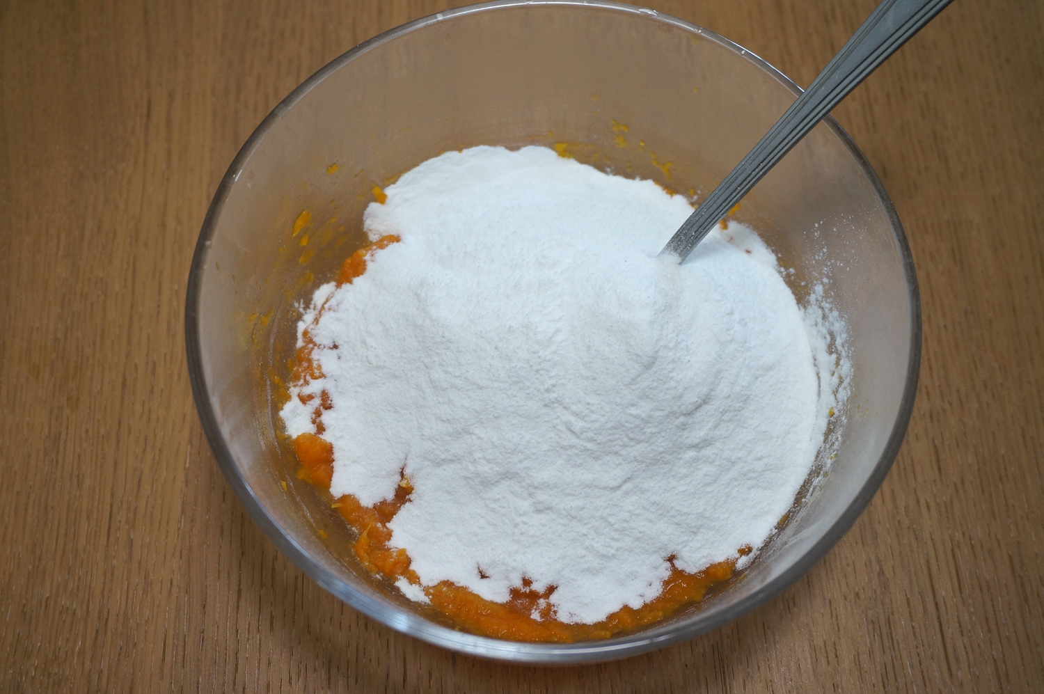 2. 糯米粉入南瓜泥中,一开始不知道多少,可以少放些,看面团状态再随时添加;http://si1.go2yd.com/get-image/0KKurZJq328