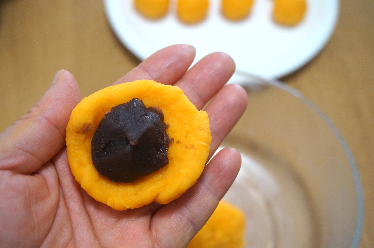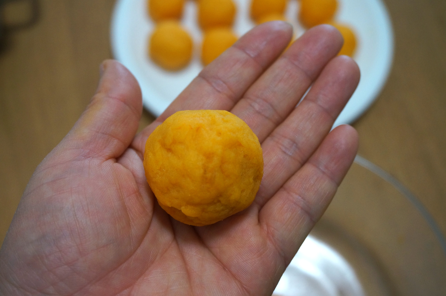 4. 揪一块南瓜糯米团,拍成小饼,再弄成小碗状,红豆沙放在中间,一边转一边团起来,像包汤圆那样;没有红豆沙也可以不放;http://si1.go2yd.com/get-image/0KKutEx2GOG