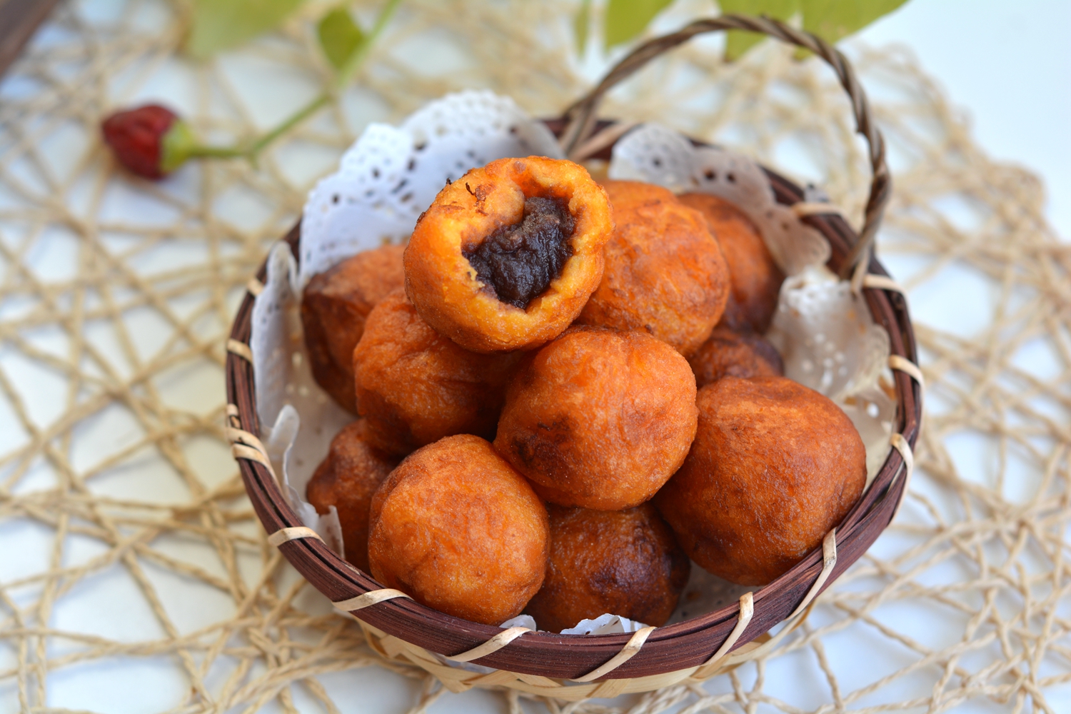 材料:南瓜,糯米粉,红豆沙,植物油,白糖