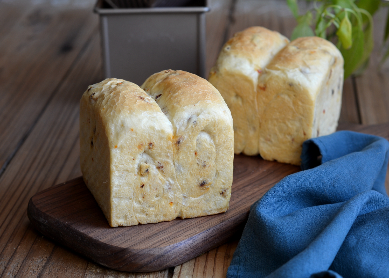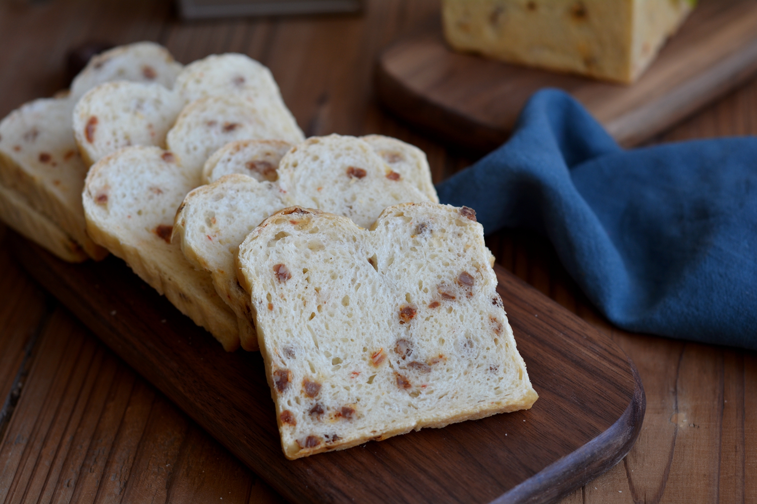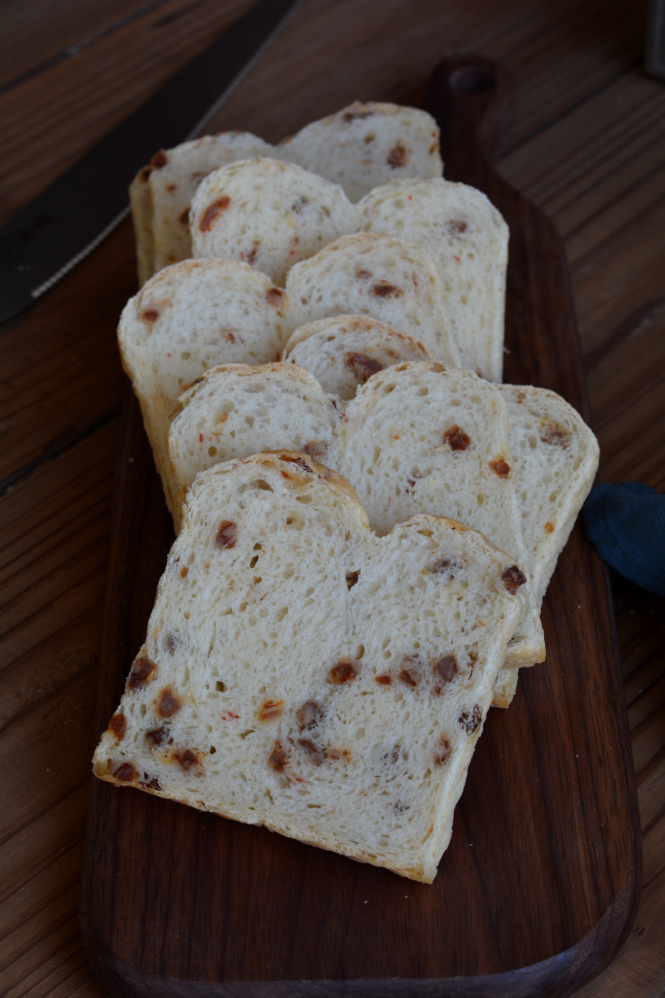 平时甜面包没少吃,即使是那种火腿肠芝士的面包,里面也没少加糖。今天我做一个腊肠味的咸吐司,嘿嘿,想不到还真不错。腊肠中的油脂渗透在面包中,感觉真有点像吃馒头,但又比馒头香多了。因为是晚饭后才开始做,天气凉发酵慢,到半夜快两点才烤完,烤完我就放在室温下晾着去呼呼了,因此你现在看到的吐司表面有些小裂纹。
