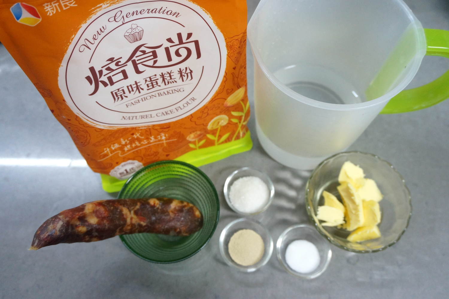 1. 全部材料准备好,腊肠是自家制作的,微辣;少许白糖是为了给酵母提供良好的发酵环境;酵母使用普通的就可以,无须使用耐高糖酵母;http://si1.go2yd.com/get-image/0KMH7vTnW5Y