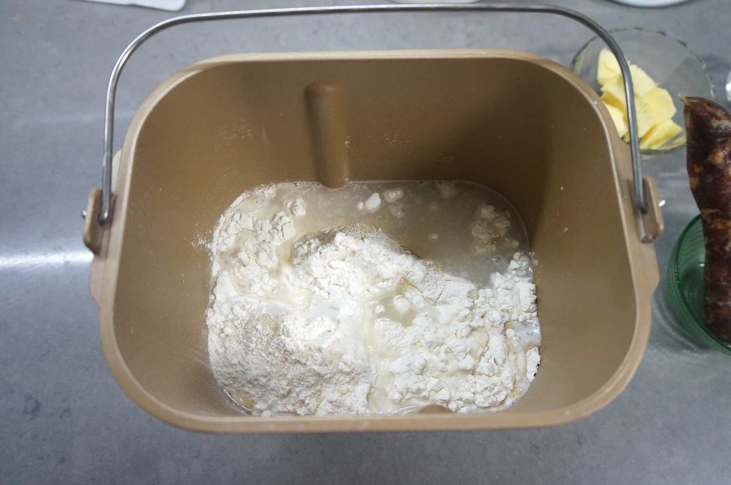 2. 除黄油、腊肠外的所有材料全部入面包桶中,面粉的吸水率不同,建议预留10克水,看面团状态再决定是否继续加水;http://si1.go2yd.com/get-image/0KMH91yHjCC