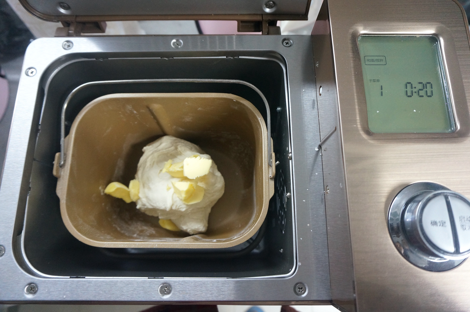 3. 启动揉面程序10分钟,待面团成团并能拉扯出厚膜时,将软化的黄油加入,继续揉面约30分钟;http://si1.go2yd.com/get-image/0KMHAg7yRhQ