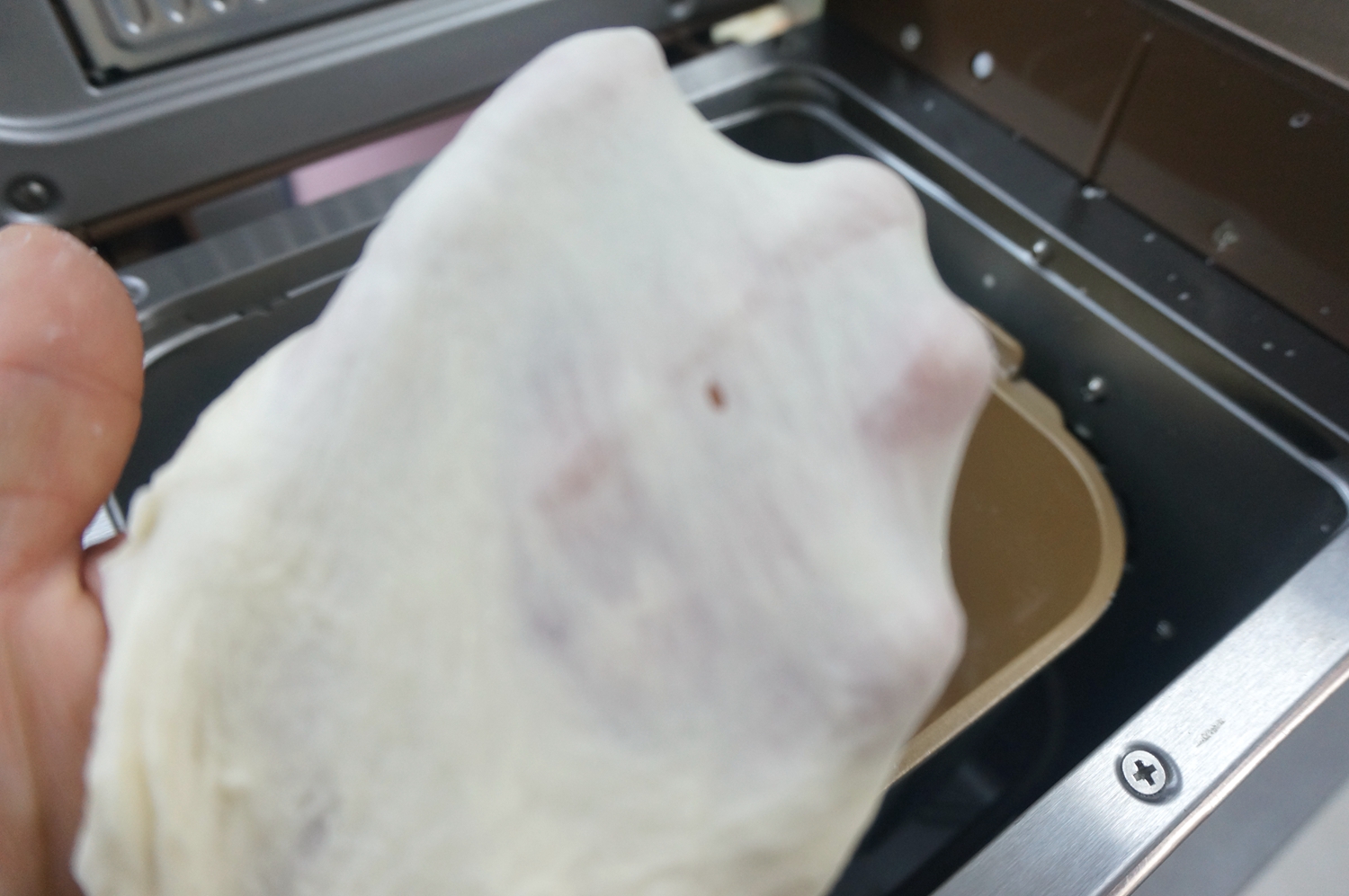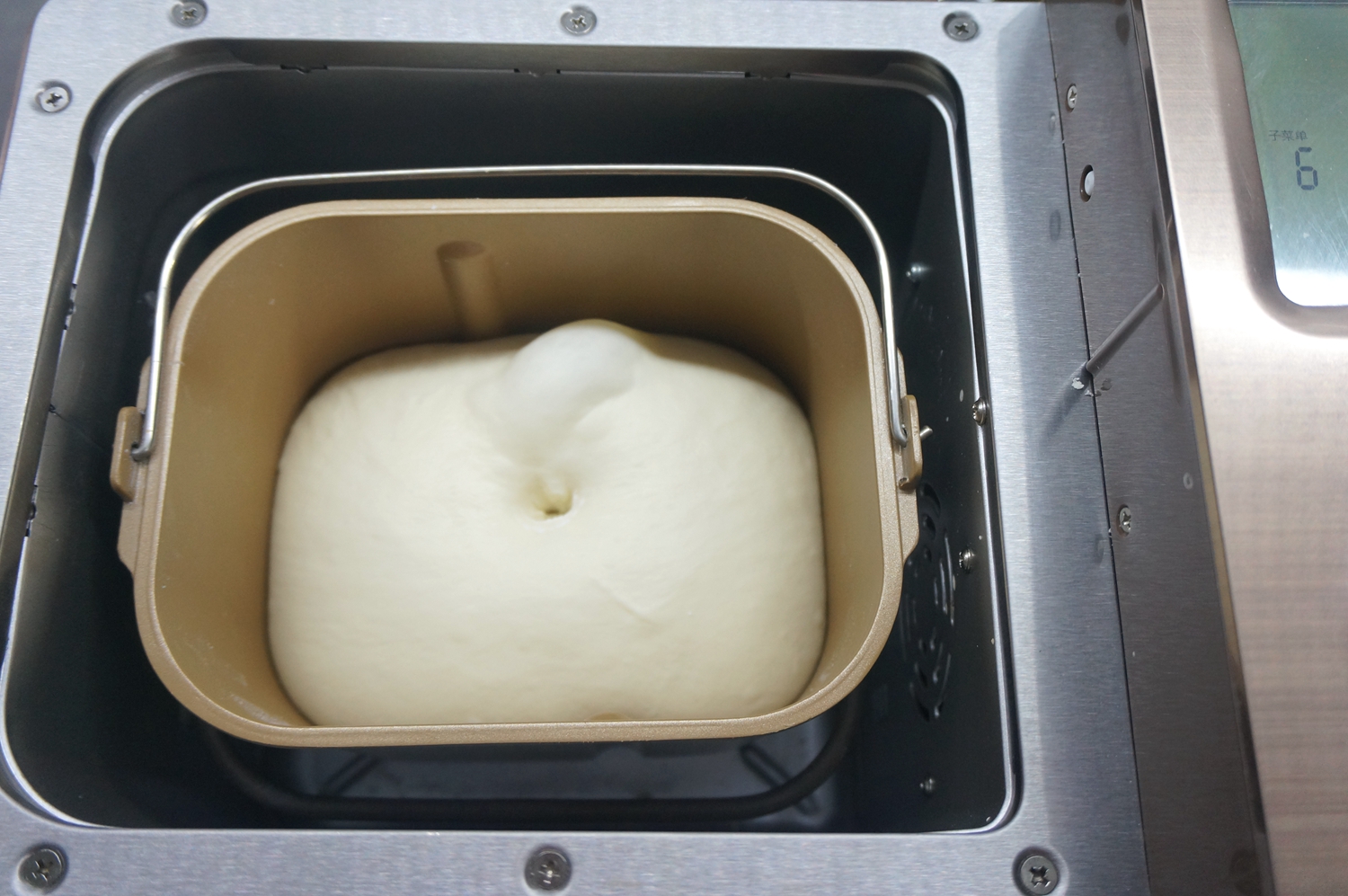 5. 将面团收圆,放在东菱6D面包机内,选择发酵程序,时间暂定2小时;待面团是原来的2.5倍左右时,手指蘸面粉在面团顶部戳个洞,不塌陷不回缩,发酵成功;http://si1.go2yd.com/get-image/0KMHCSooysi