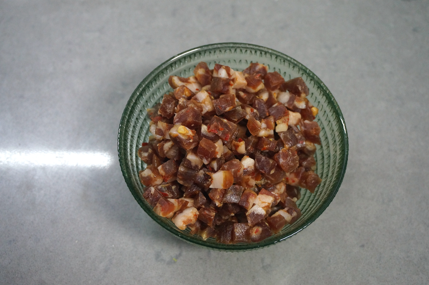 6. 腊肠在面团发酵时切成小丁备用;http://si1.go2yd.com/get-image/0KMHDJH3jkG