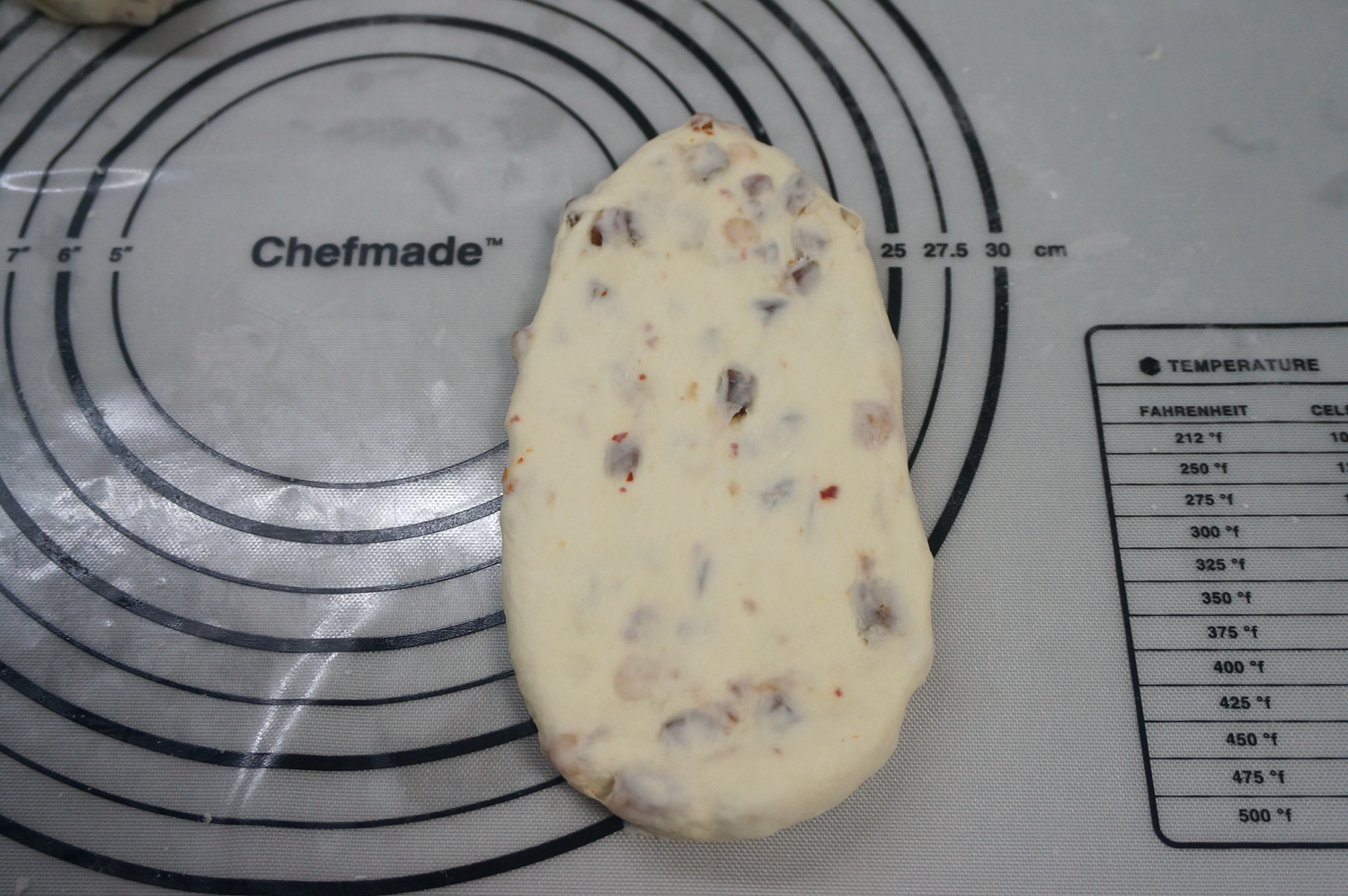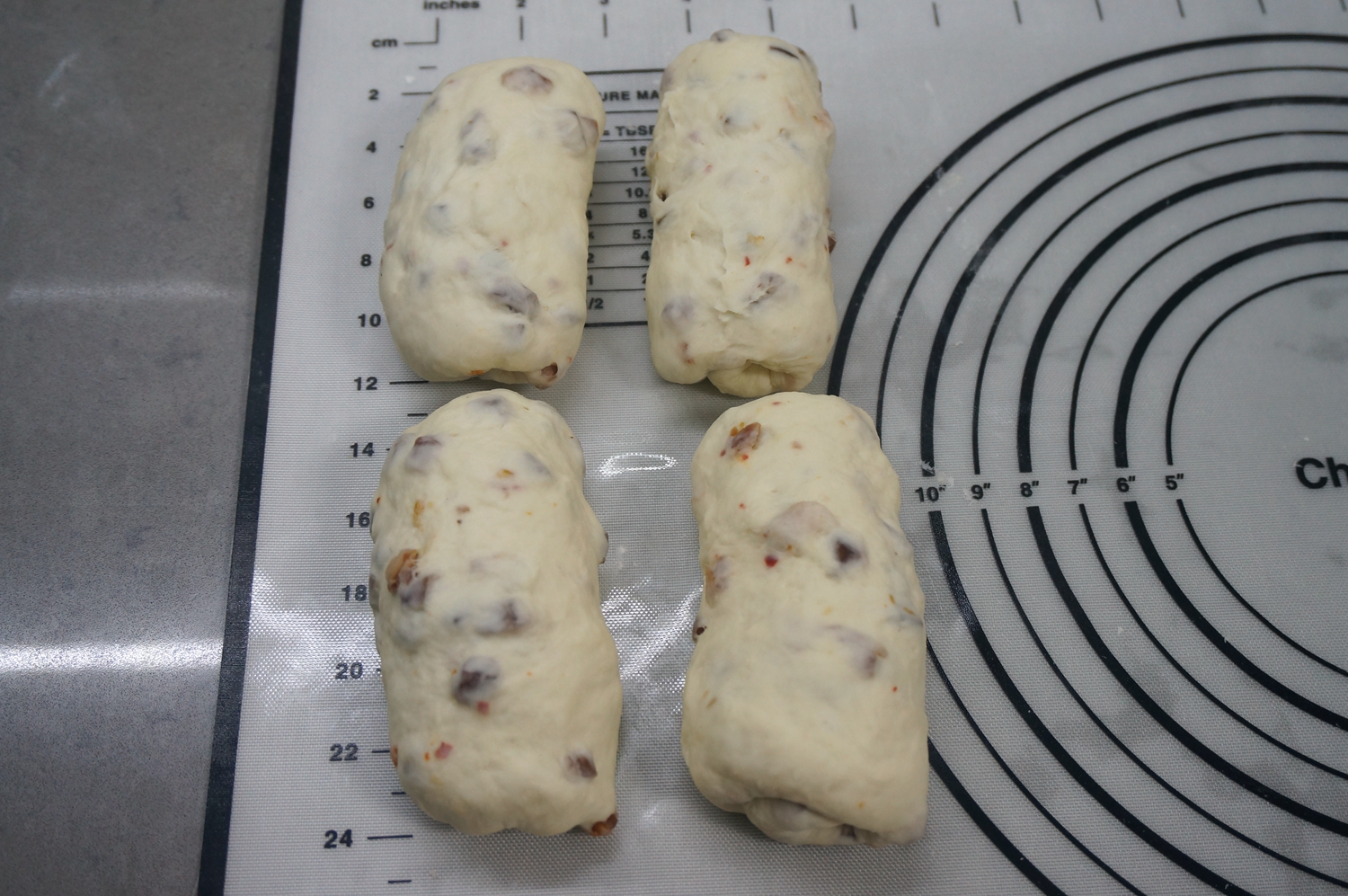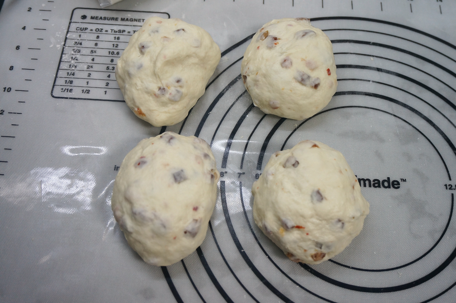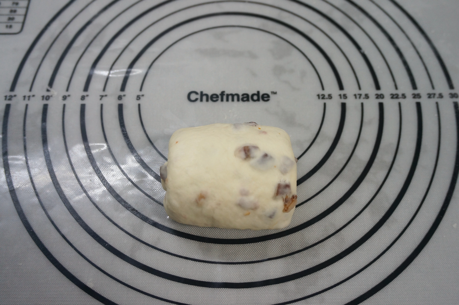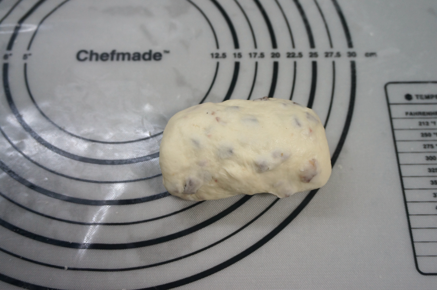 7. 面团放在揉面垫上,将腊肠丁揉进面团中,不要过度揉,均匀即可,称重分成四等份,盖保鲜膜饧5分钟;另外一种方法,可以将面团分割擀平后,铺撒腊肠丁卷成卷;两种方法的不同点在于,前者腊肠丁比较均匀,后者组织看上去更加清晰;http://si1.go2yd.com/get-image/0KMHEsy8AAi
