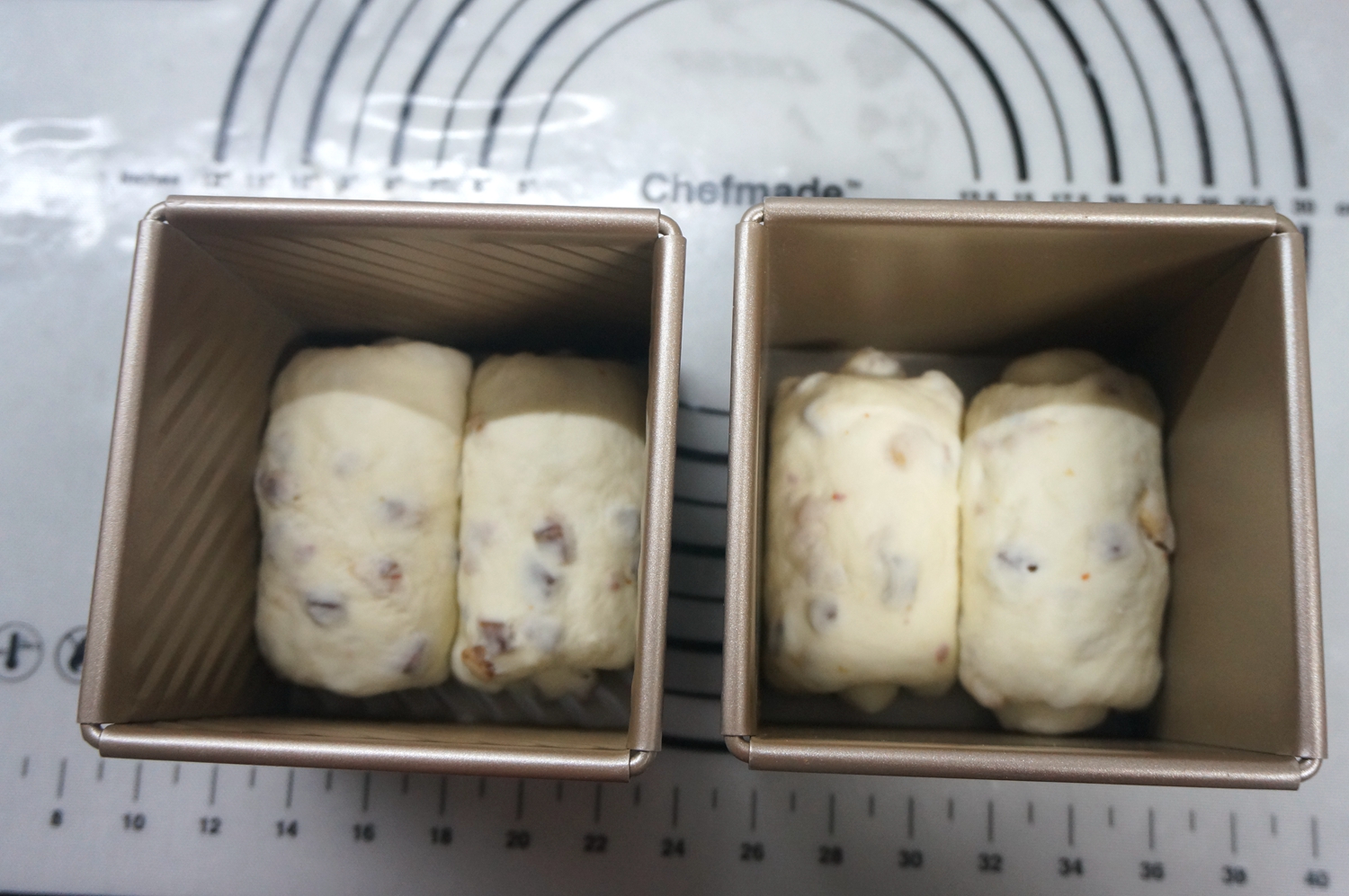 12. 四个面包卷分别入水立方吐司盒中,也可以用一个450克吐司盒;放在温暖湿润处进行二次发酵;这个过程有点漫长,可以放进烤箱中,放一碗水,温度在35度左右;http://si1.go2yd.com/get-image/0KMHR4HcteK