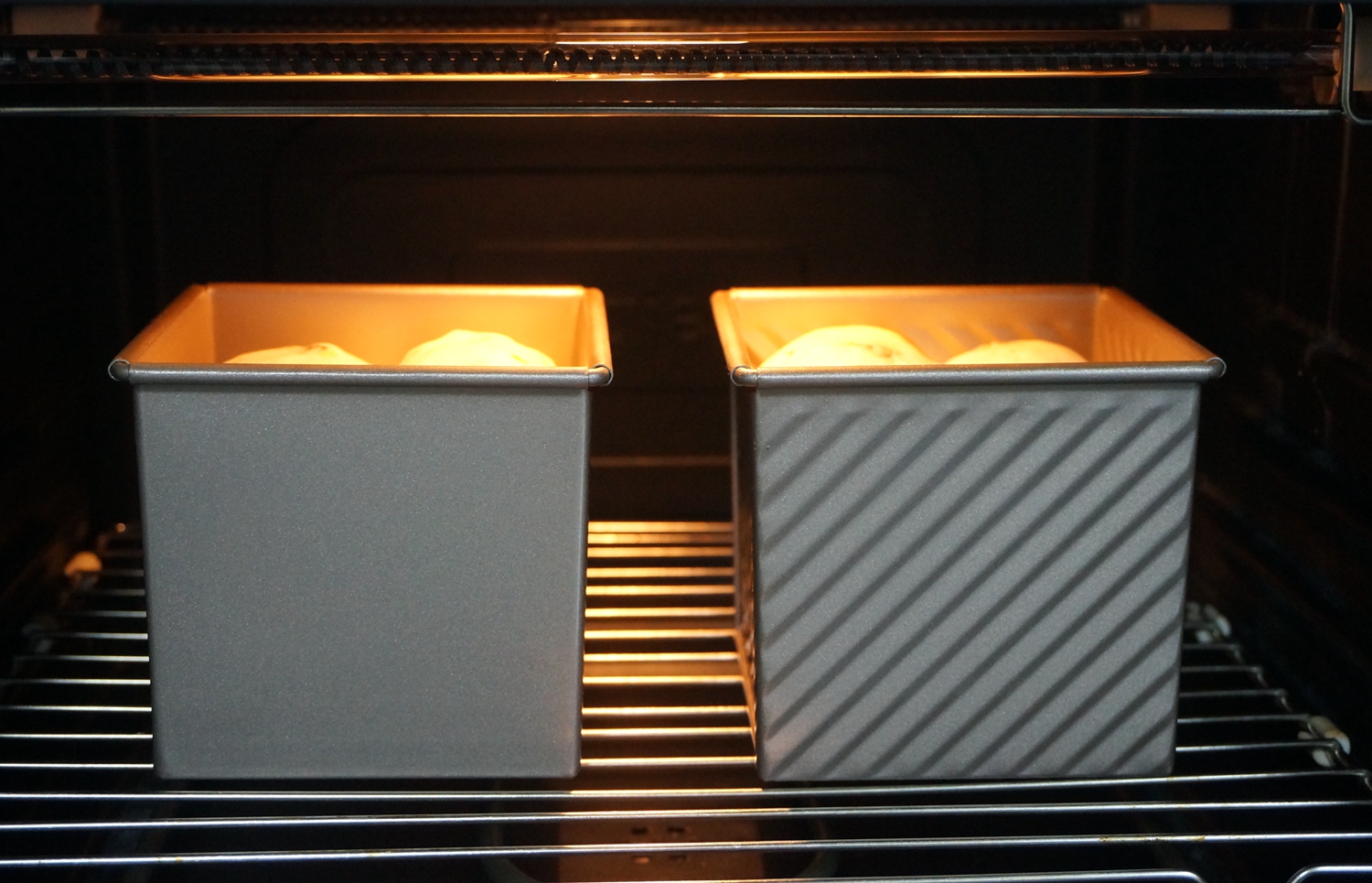 13. 待面团涨到8分满时,吐司生坯从烤箱中取出,烤箱预热180度;待预热完成后,将生坯再次放入烤箱中层,180度,上下火,35分钟;没有多少糖,因此几乎没有上色;出炉后,从吐司模具中脱模,晾架上晾凉后入袋封存。