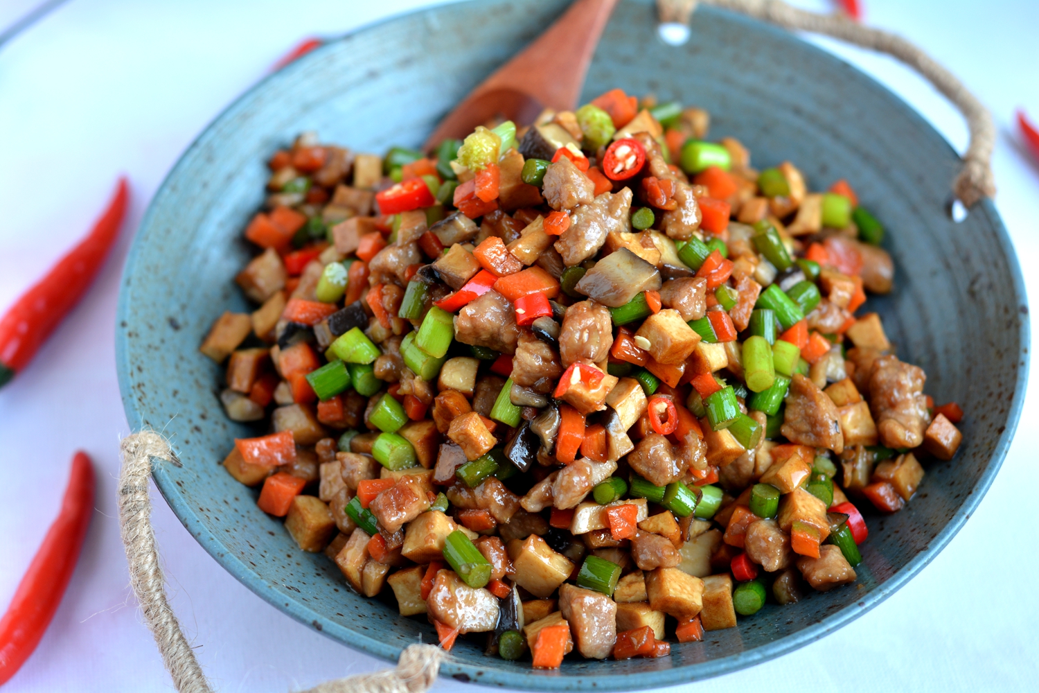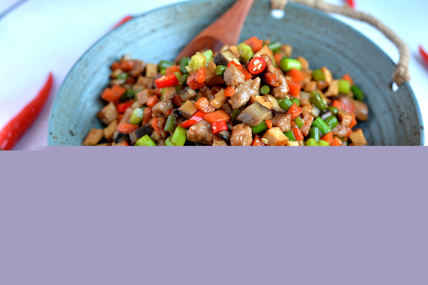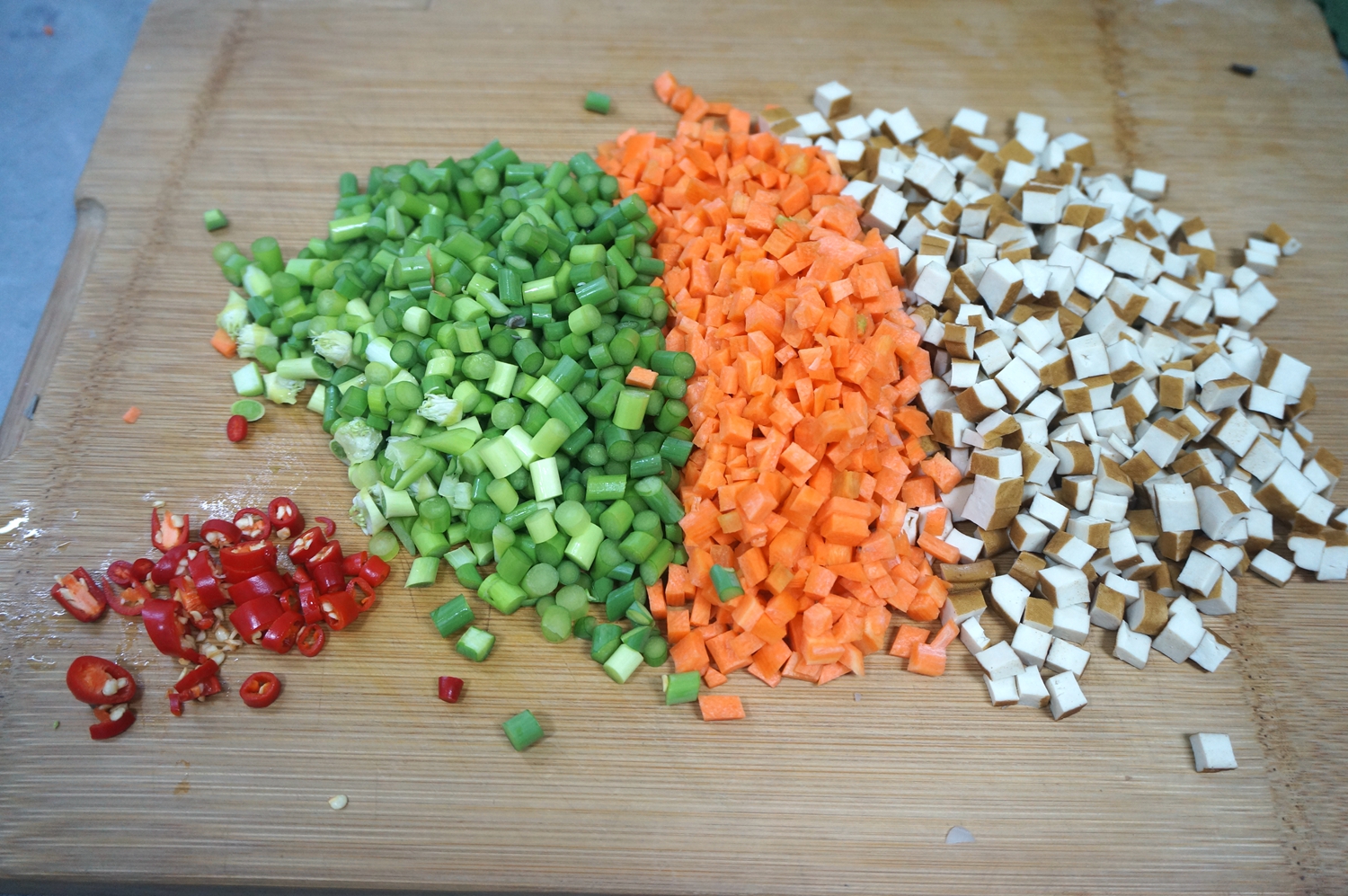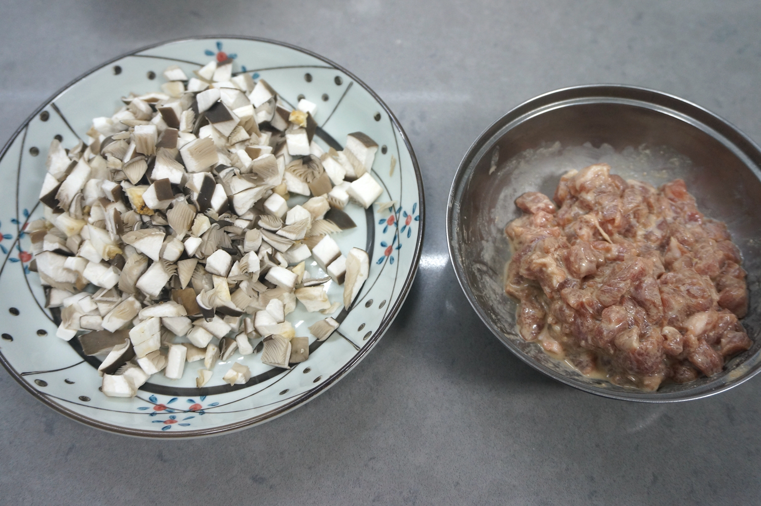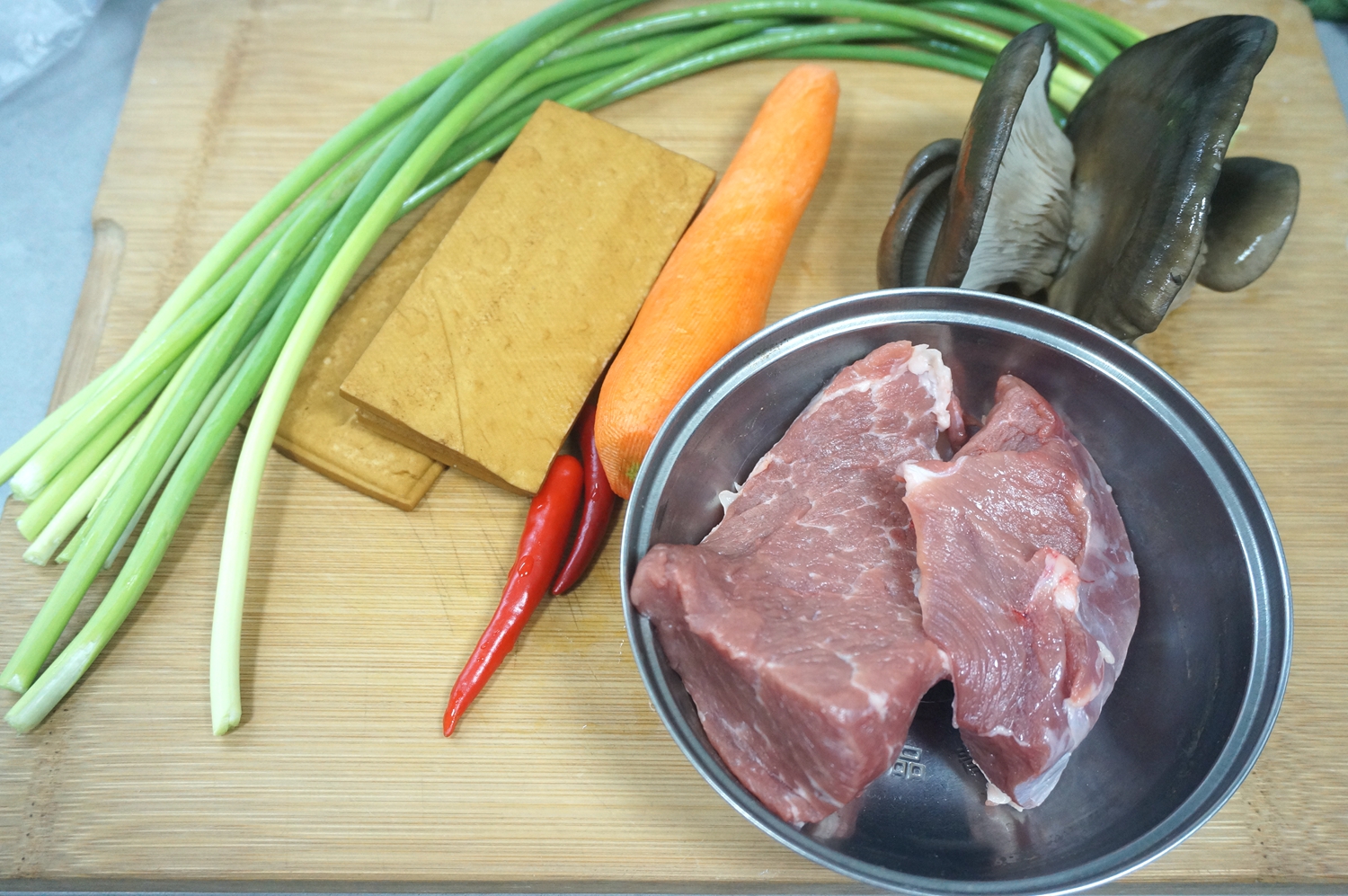 材料:猪瘦肉1块,平菇数朵,胡萝卜1棵,蒜薹1小把,豆腐干3块,小米辣2个,植物油,盐,蚝油