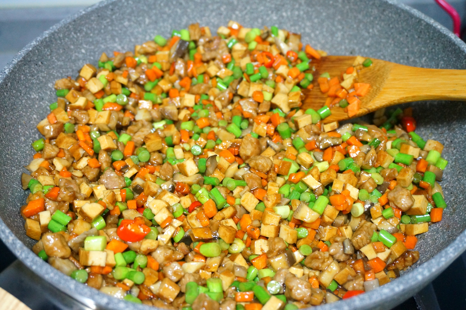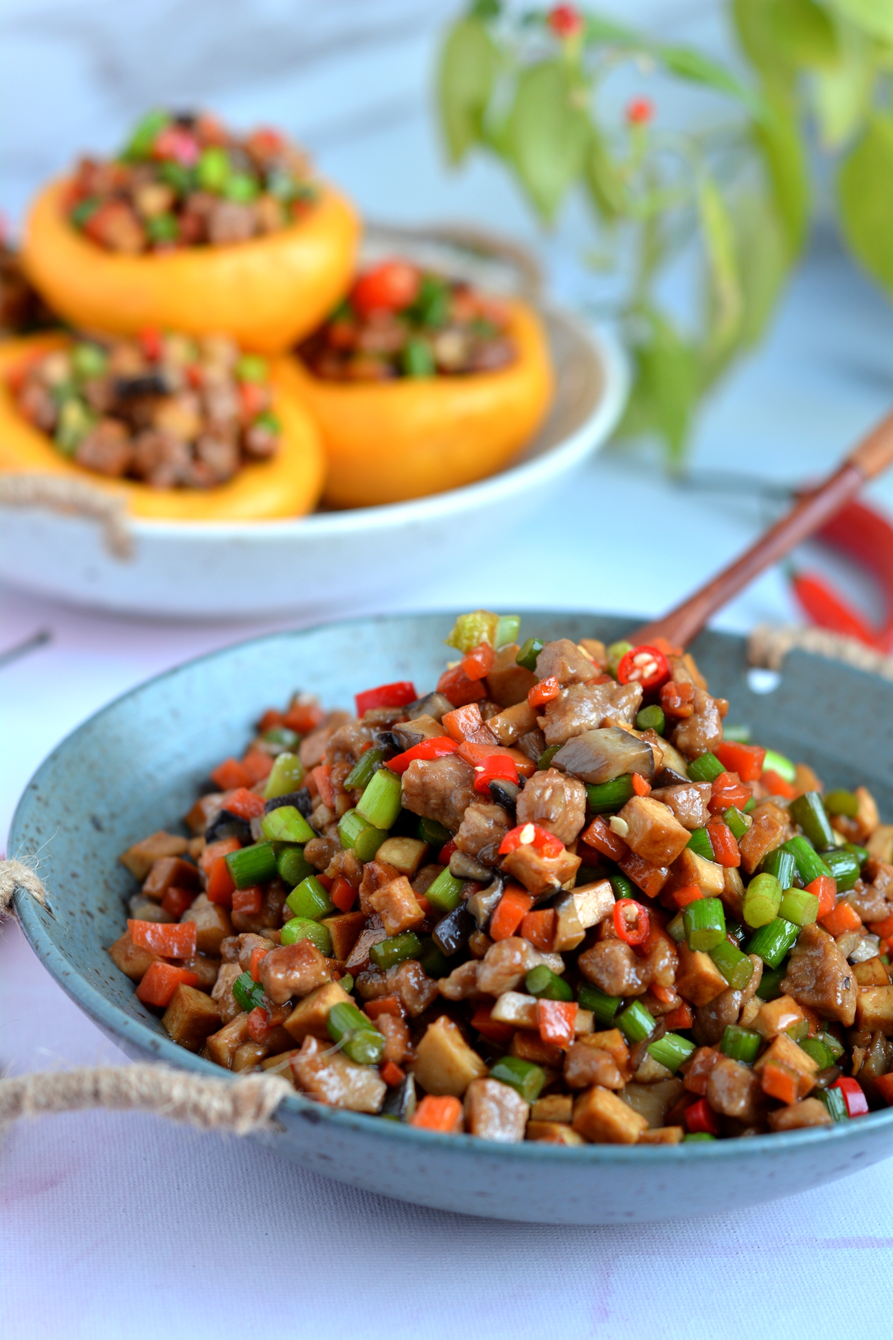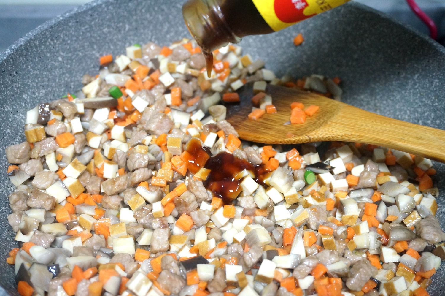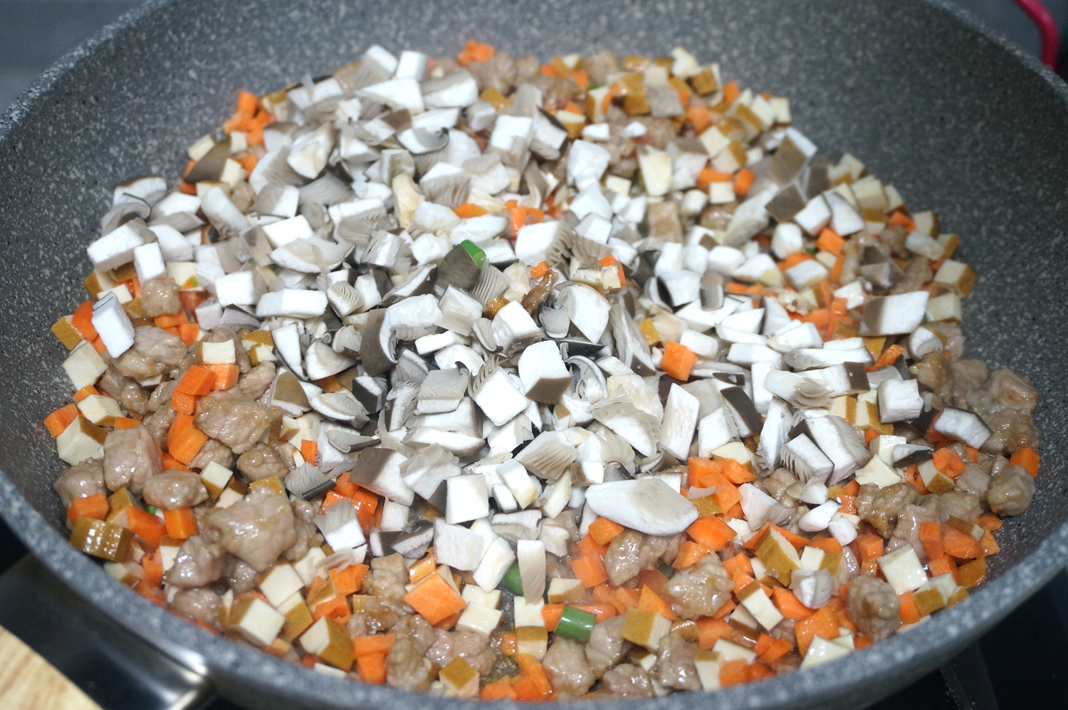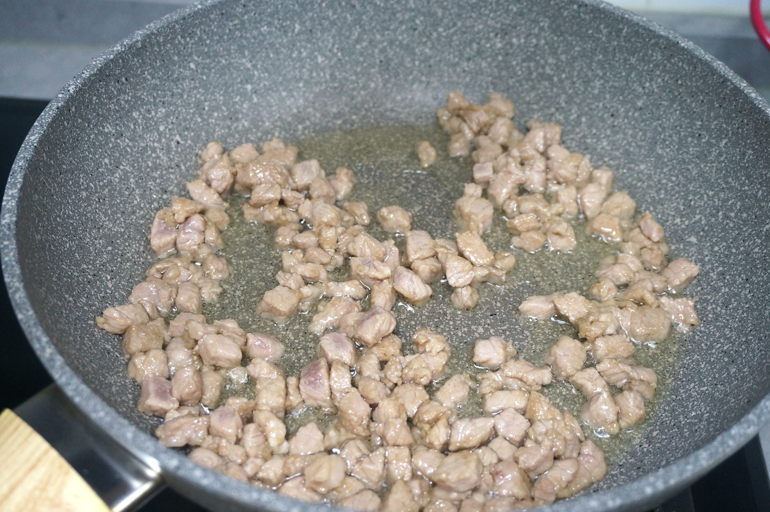 材料:猪瘦肉1块,平菇数朵,胡萝卜1棵,蒜薹1小把,豆腐干3块,小米辣2个,植物油,盐,蚝油