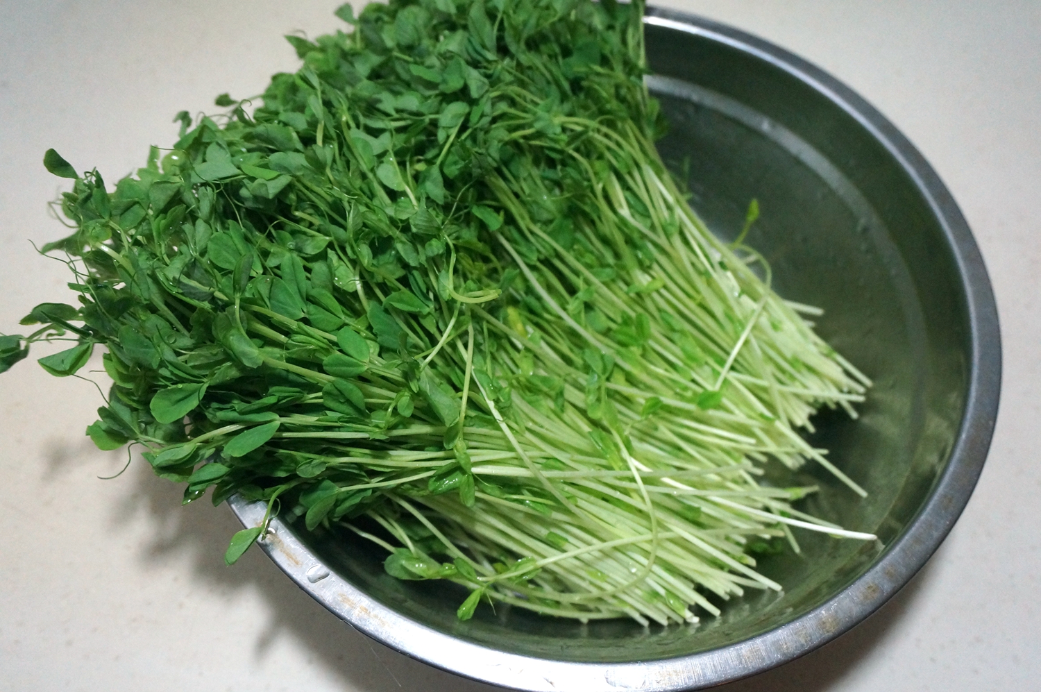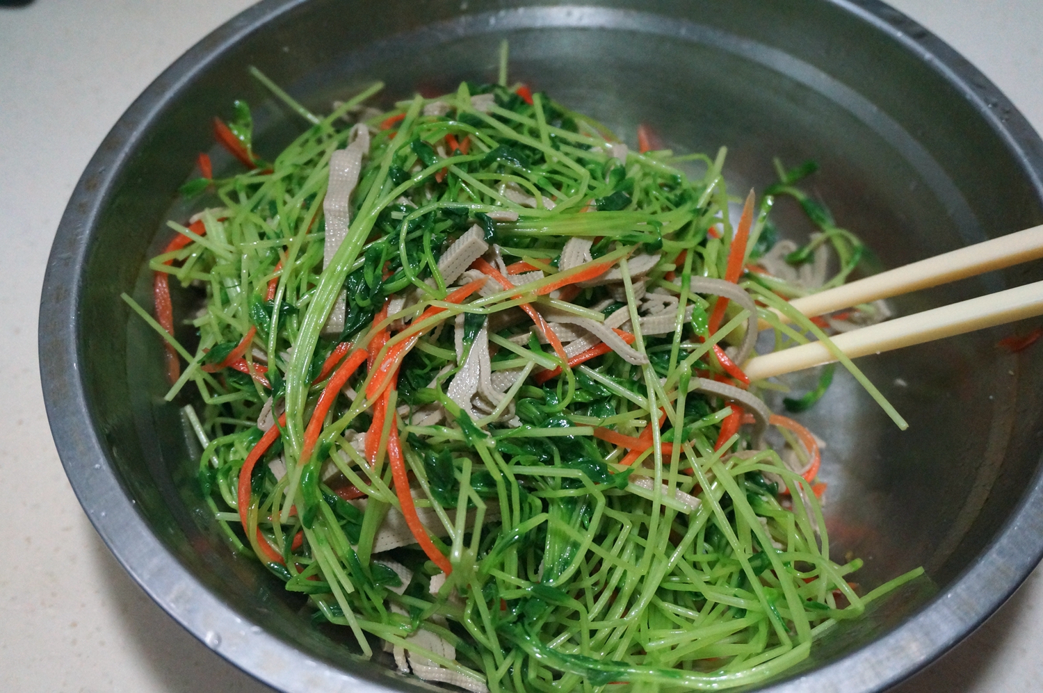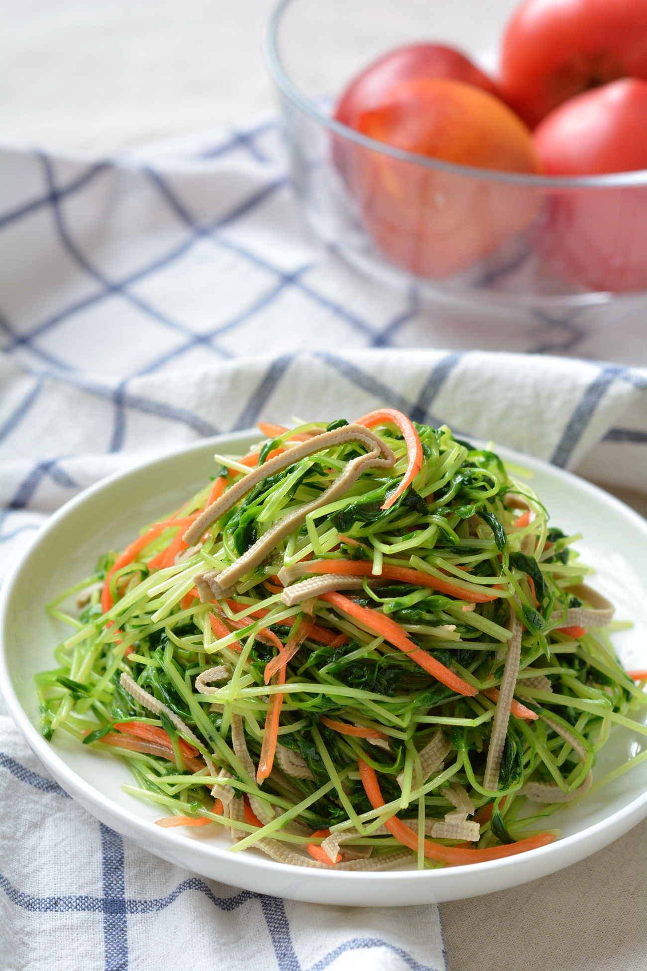 材料:豌豆苗1把,五香豆腐丝1块,胡萝卜半根,盐少许,芝麻油适量