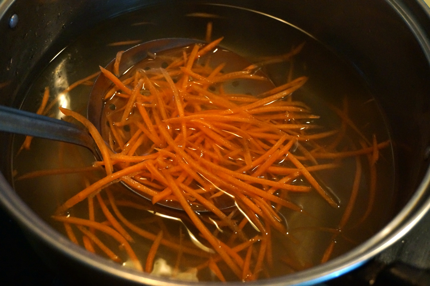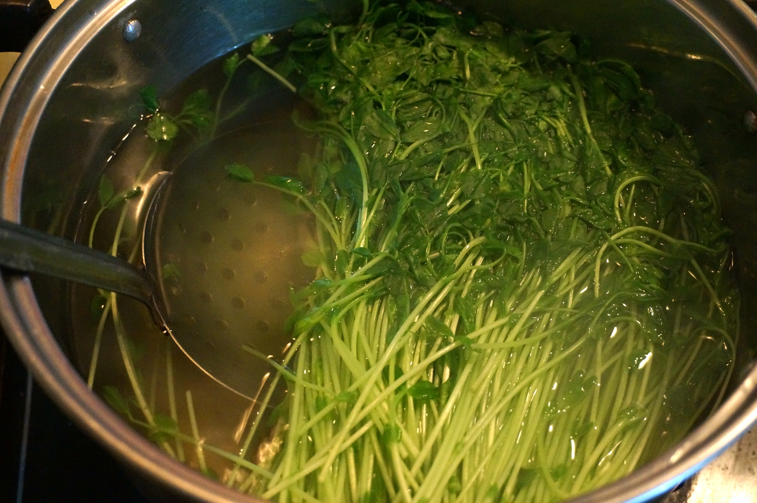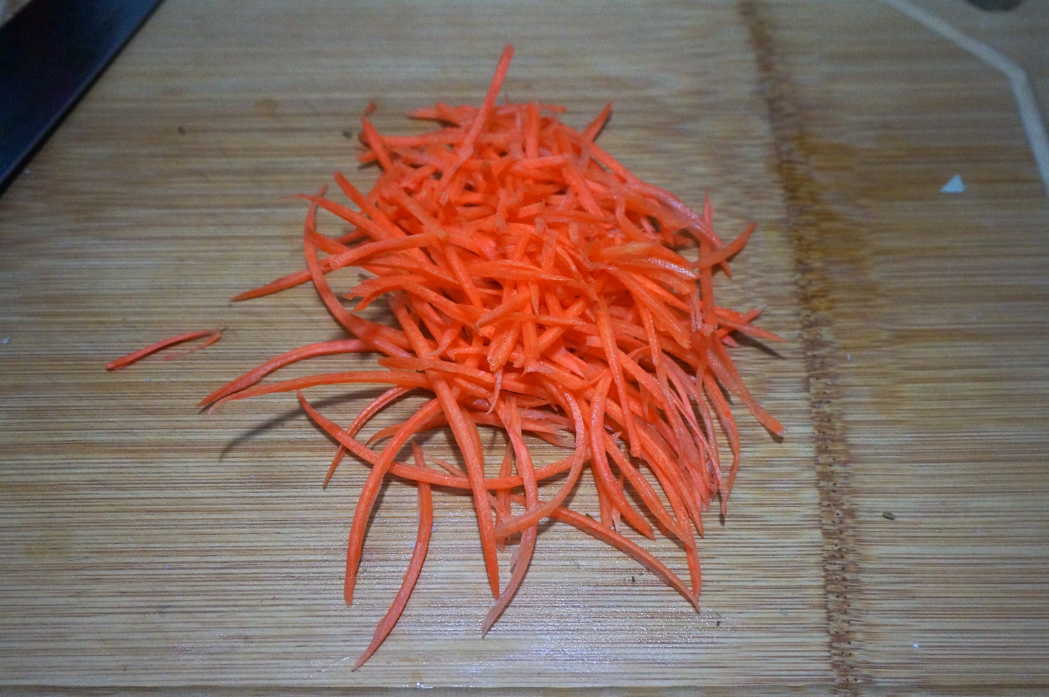 材料:豌豆苗1把,五香豆腐丝1块,胡萝卜半根,盐少许,芝麻油适量