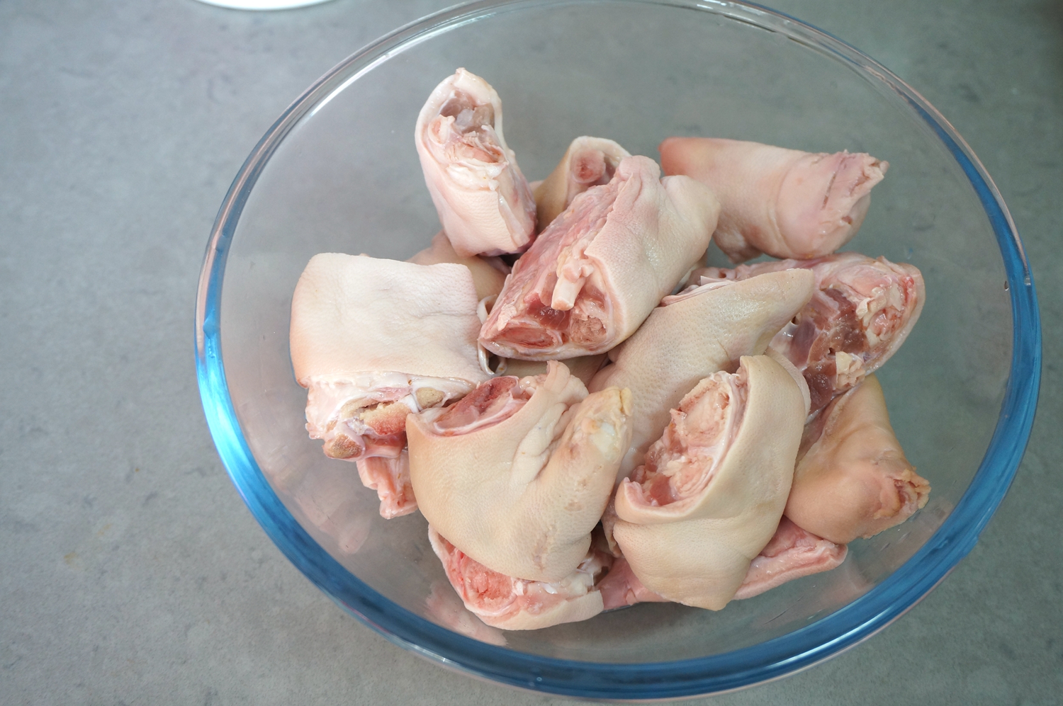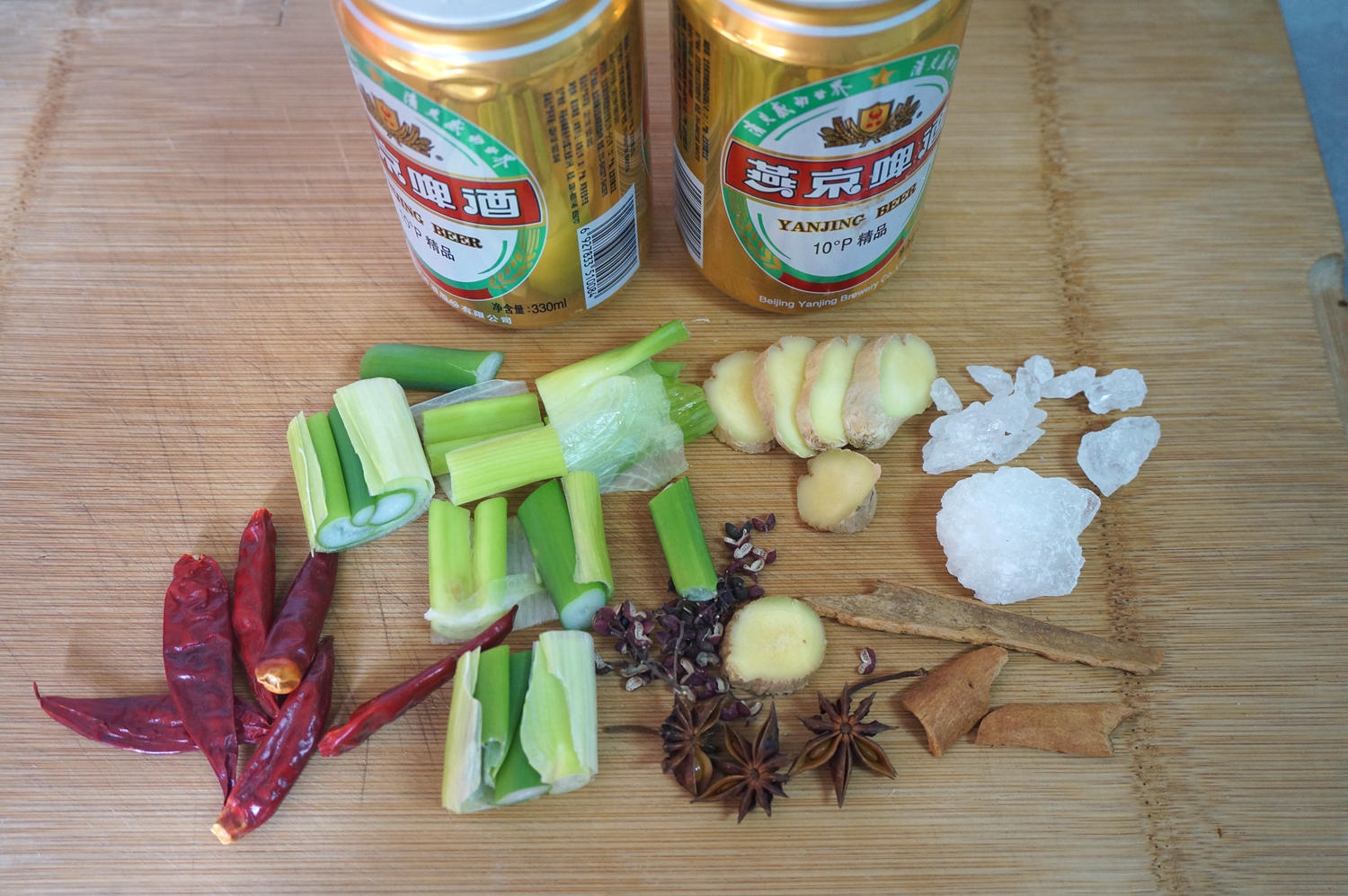 材料:猪蹄3个,啤酒2听,大葱半棵,干红辣椒数个,姜1块,八角3个,花椒1撮,桂皮1块,盐适量,酱油少许,冰糖1大块,油少许