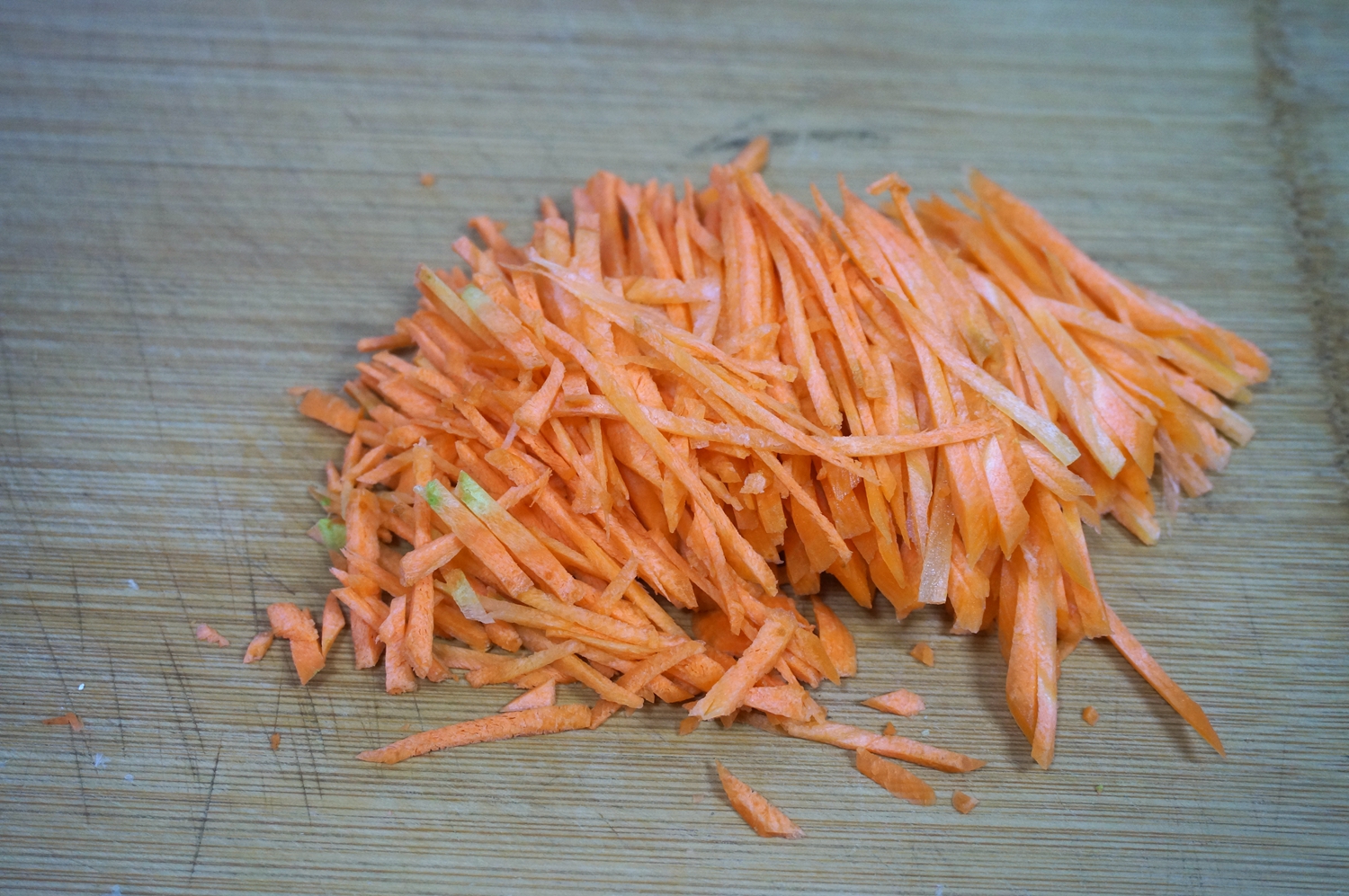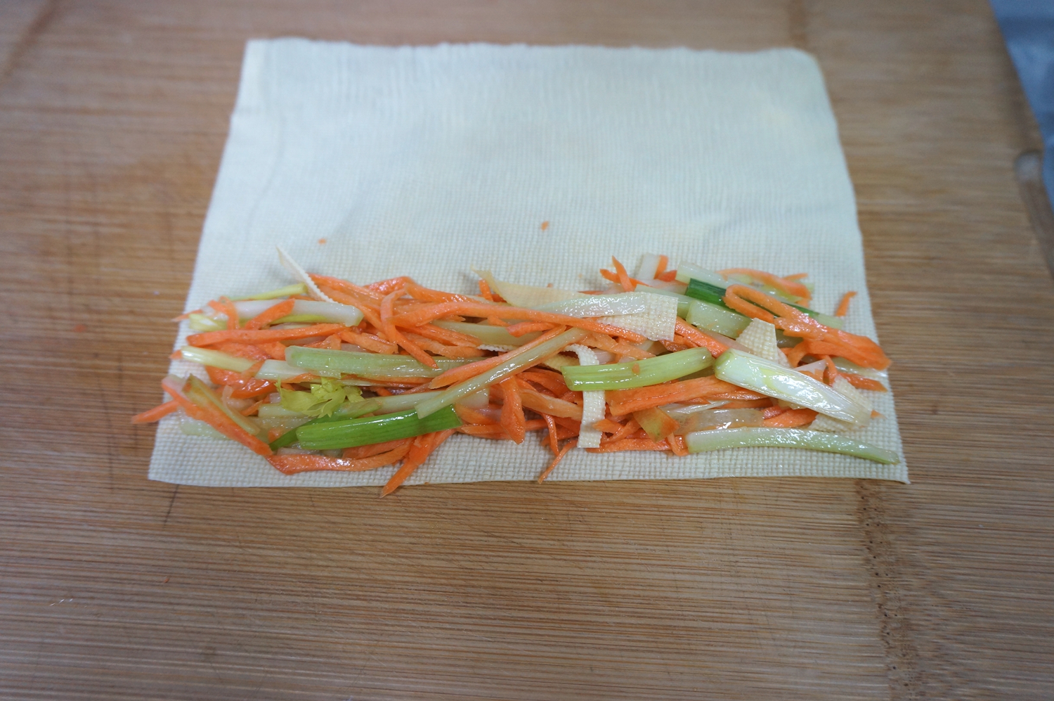 材料:豆腐皮2张,芹菜1棵,胡萝卜1根,香葱2棵芝麻油少许,盐少许,甜面酱适量