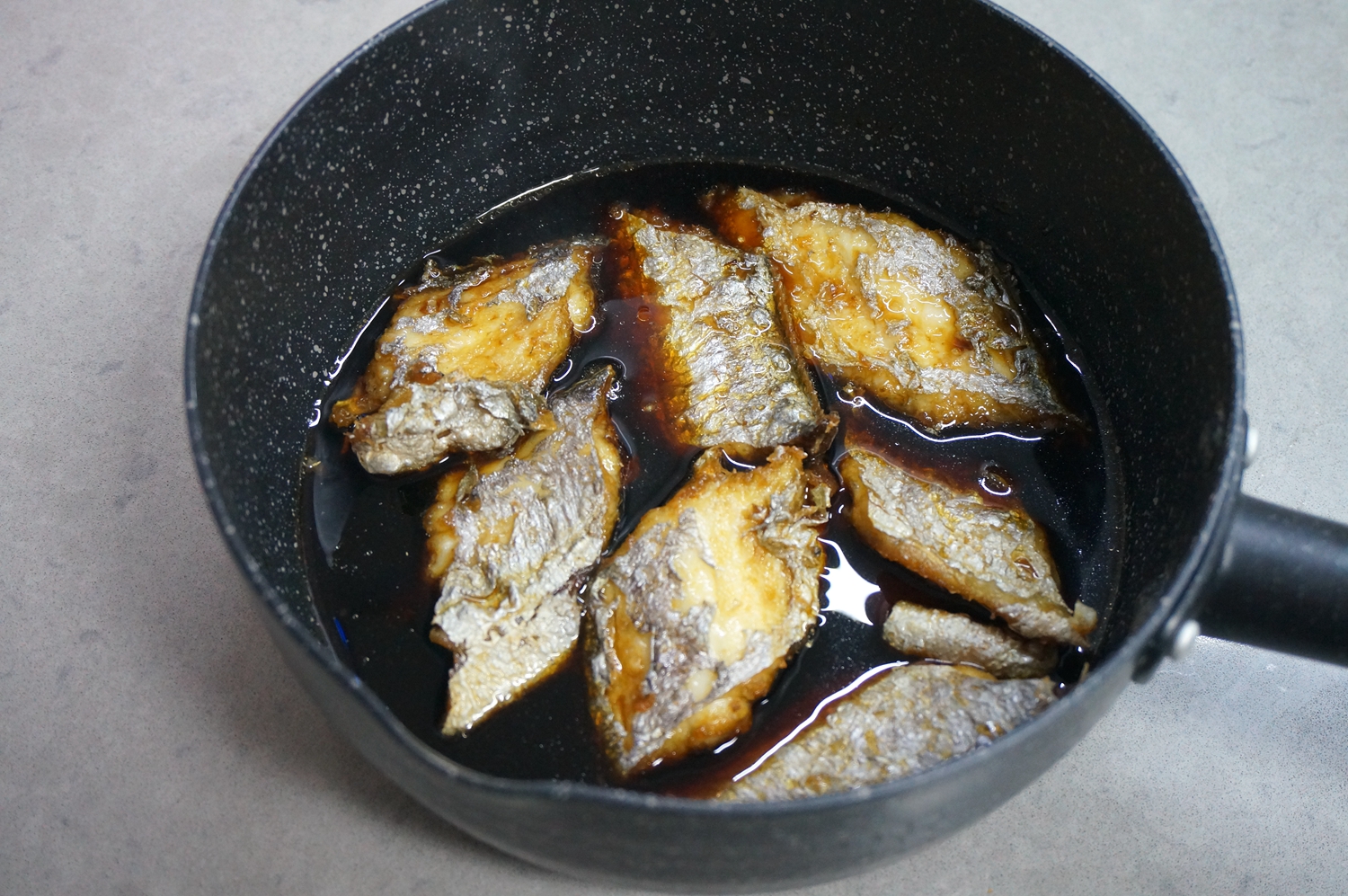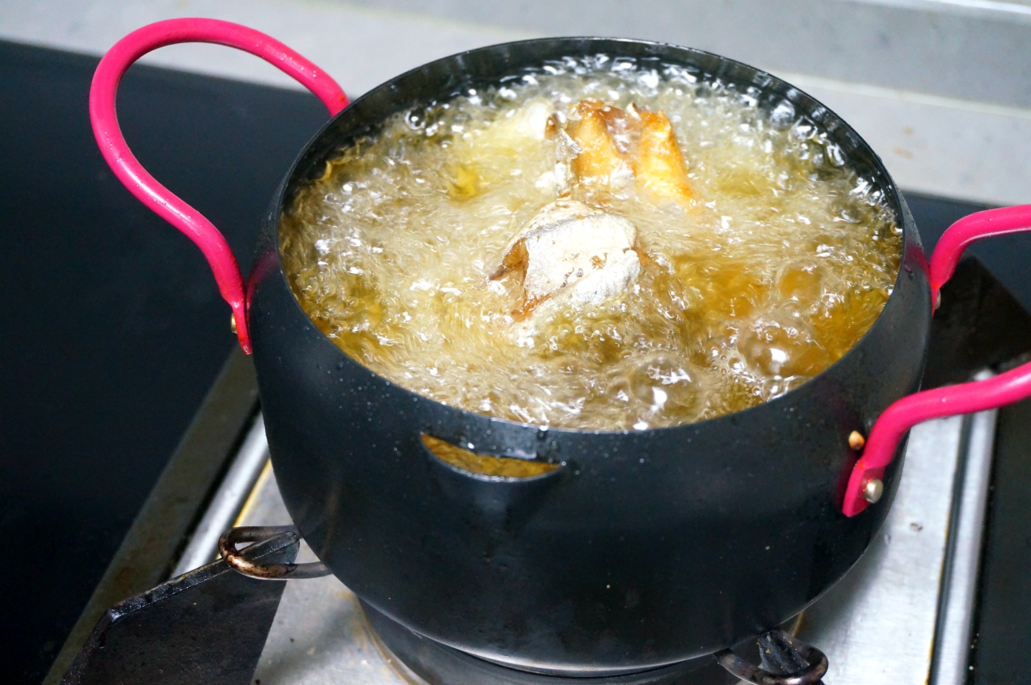 4. 将油温再次升高,炸过一遍的带鱼再次分批入油锅中,炸至两面焦黄,并且鱼身略干燥;