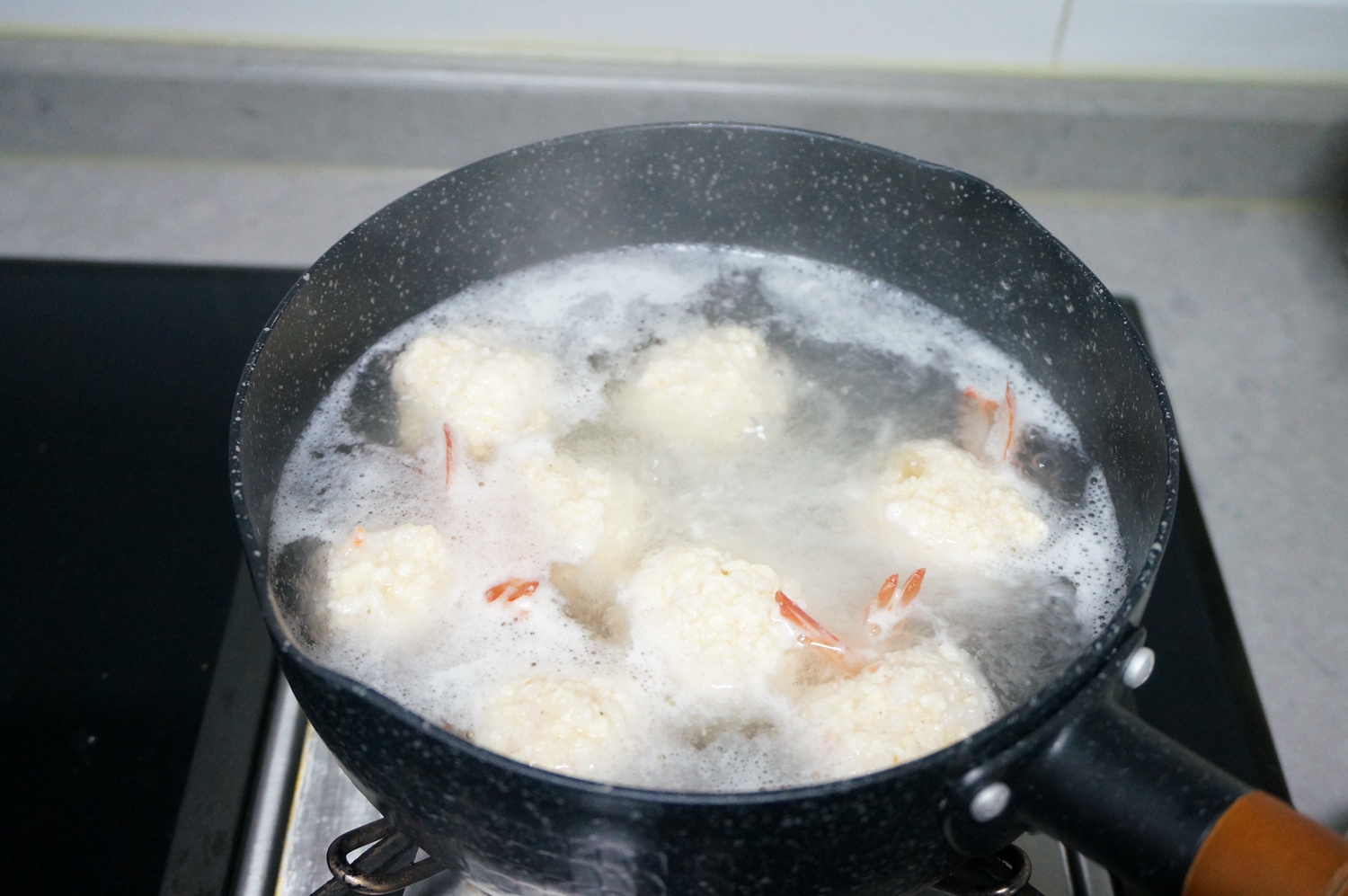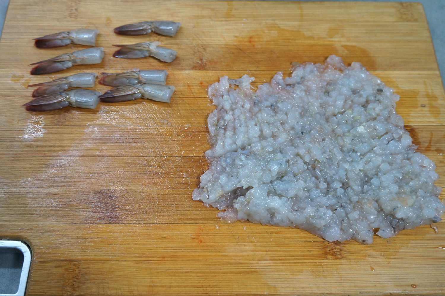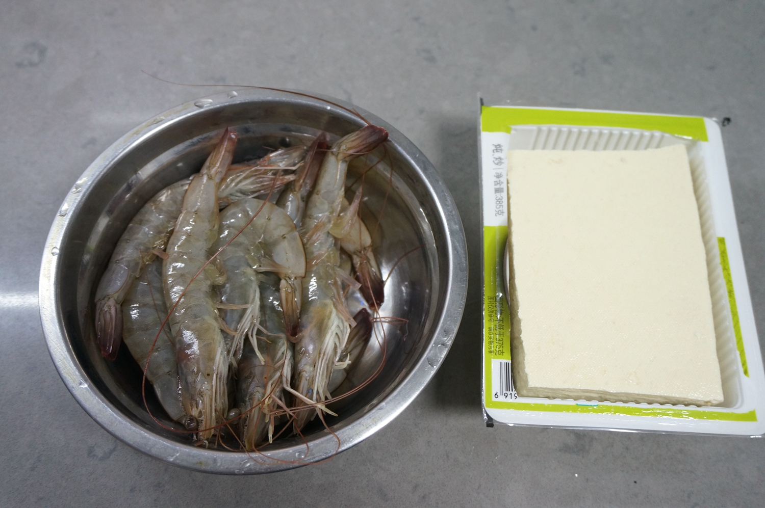 材料:虾8只,豆腐1把,淀粉2大勺,白胡椒粉少许,盐少许,生抽少许