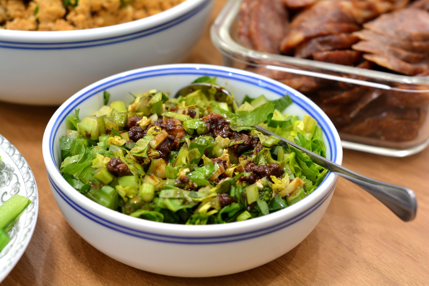 炸酱香醋拌芹菜叶,只需两勺带肉丁的炸酱和一点点醋,清爽开胃。