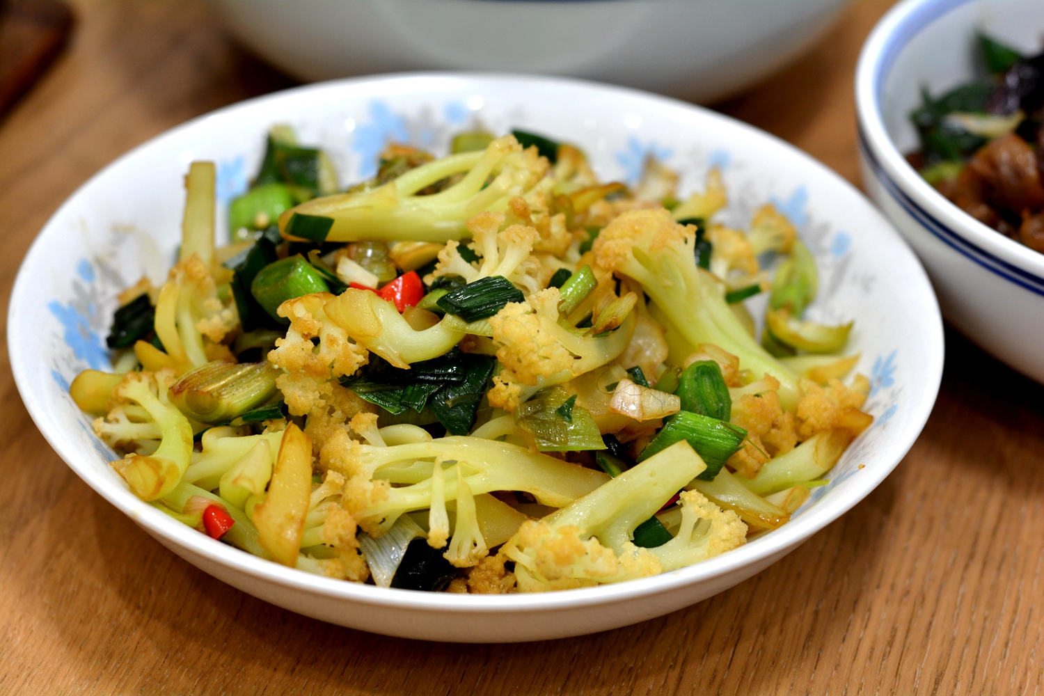 青蒜炒菜花。透着青蒜便宜了,这几天炒菜总喜欢放青蒜,增色提香提味儿。