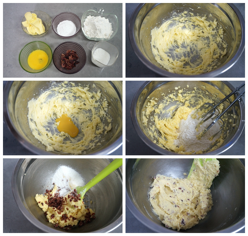 材料:黄油70克,蛋液30克,糖粉30克,蔓越莓15克,椰蓉10克,低筋面粉90克