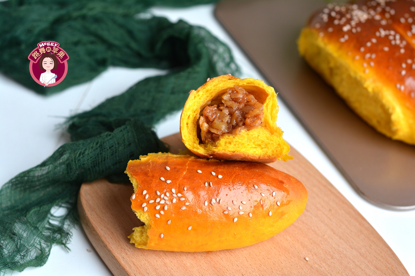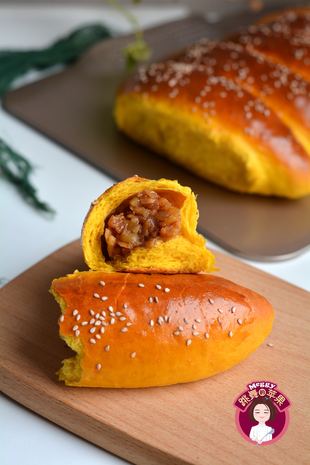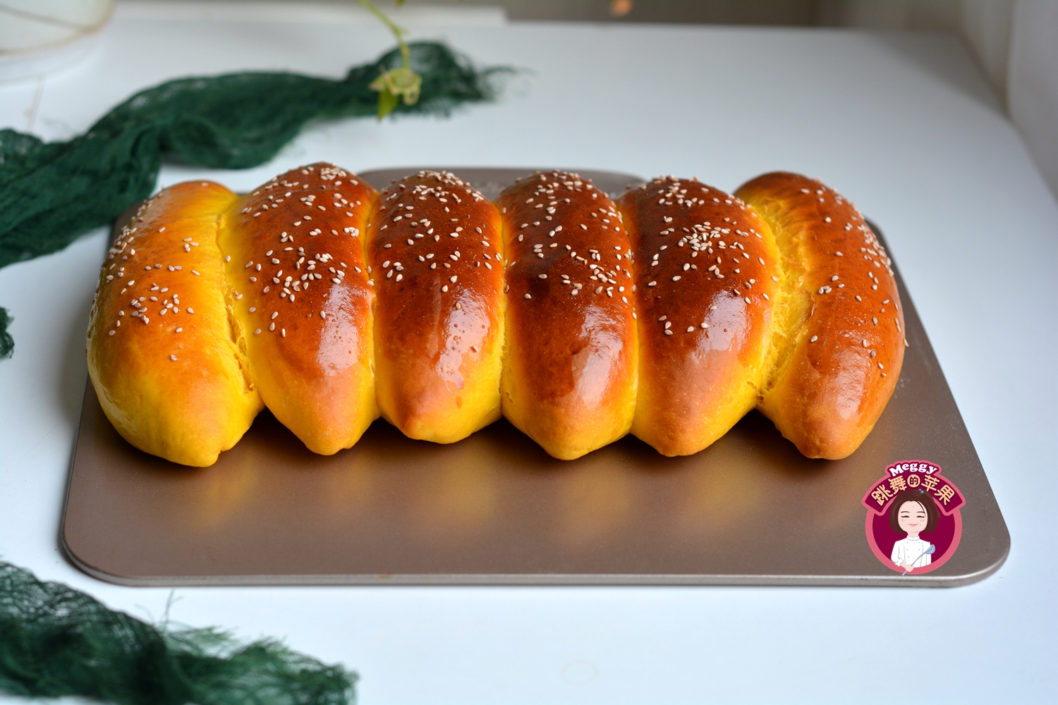 面包材料:高筋面粉250克,酵母3克,白糖35克,黄油30克,南瓜泥140克,奶粉10克,鸡蛋液60克,表面刷蛋液少许