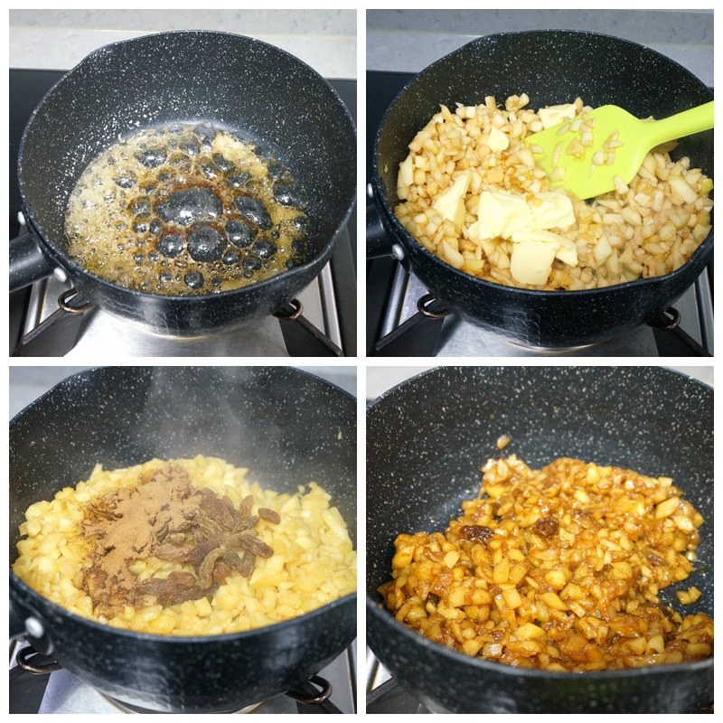 6. 将去皮去核的苹果切小丁,入焦糖中翻炒,再加入黄油同炒;
