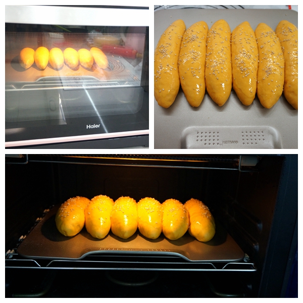 15. 将面包生坯送入预热好的烤箱中层,180度上下火,20分钟,出炉后移到晾架上,晾到手温入袋封存。