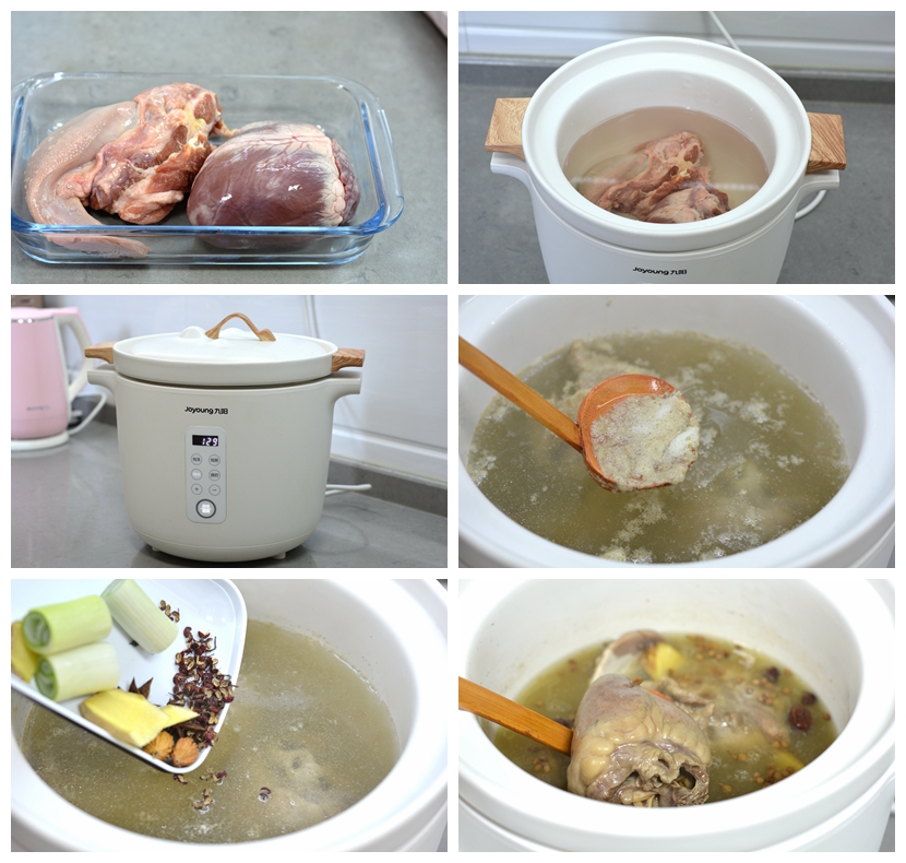 清炖料:猪心1颗,猪舌1条,八角2颗,砂仁2颗,花椒1撮,大葱半根,姜一块,料酒少许