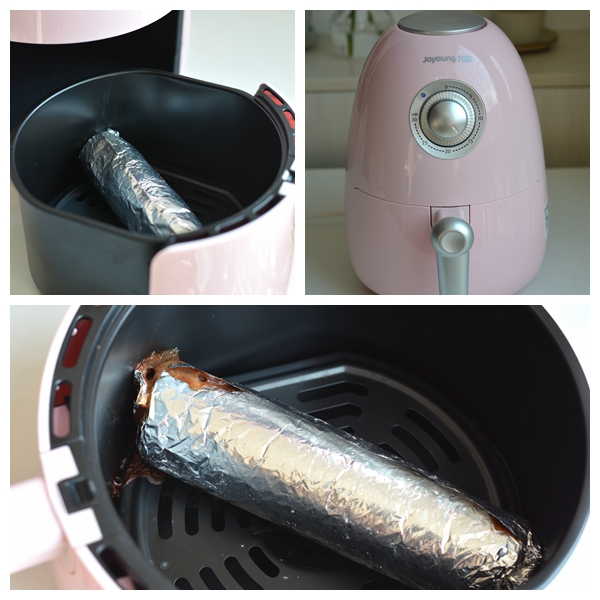9. 空气炸锅预热2分钟,默认温度200度;预热完成后,将牛肉卷放进炸篮,推入炸锅中;