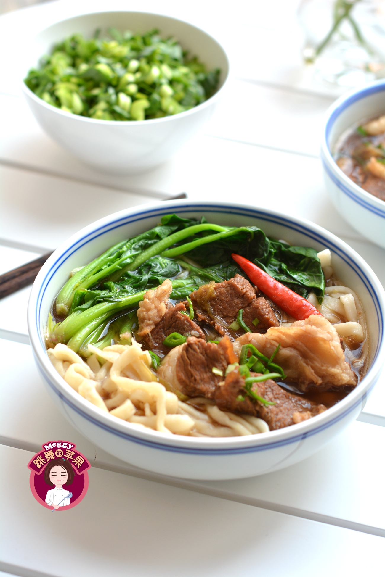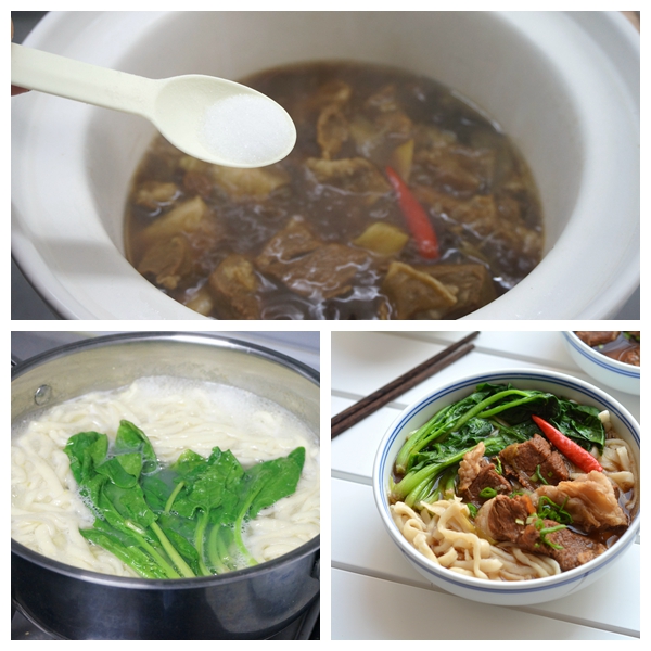 12. 面条和青菜入锅中,再浇上牛肉和汤,撒青蒜末,喜欢辣的再淋辣椒油,开吃吧!再罗嗦一句,不要用小碗,换个大碗或者小盆儿才过瘾!