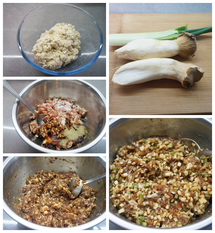 材料:面粉500克,320克左右,肉馅350克,杏鲍菇2根,大葱半根,盐适量,蚝油少许,黑胡椒粉2克,酱油少许,植物油适量