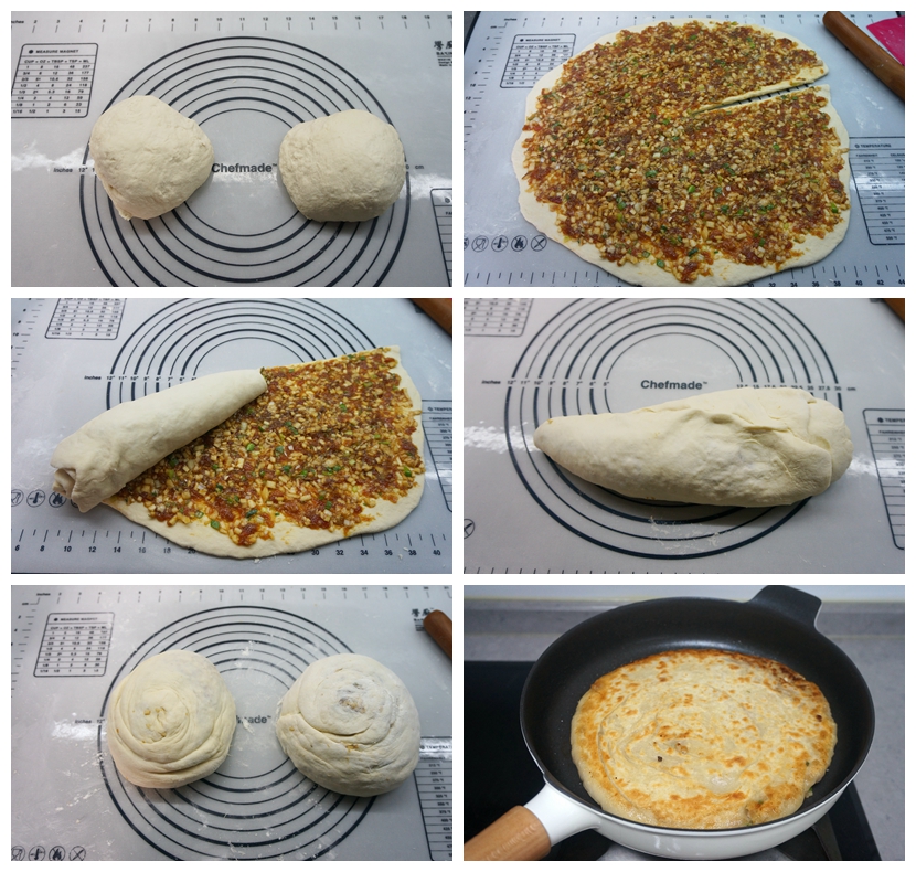 面团要揉得软一些,水量是面粉量的60%左右;肉馅中也不建议打太多的水,能混合成粗就成。太湿的肉馅在加热过程中渗出的汤汁容易将面皮泡软泡糟,吃起来也没那么香了。饼的方法很简单,就那么划一刀,再卷。上次的干香千层饼,因为要假设画一个“井”字,有朋友说有点难,而且用语言难表达,因此这次我专门做了一个超级简单的。生馅熟馅都适用,即使是普通的千层烙饼也可以用此法。