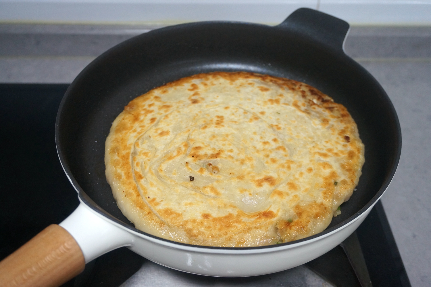 2. 一定要全程小火烙,因为饼很厚,外面看着焦黄了,而内部还是生的,可适当加一点水焖烙,听到滋滋声时打开锅盖放放水汽,饼还是焦香的;可以分成三个小面团,饼做得小一点,就熟得快了。