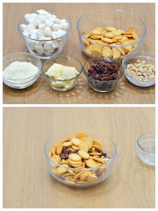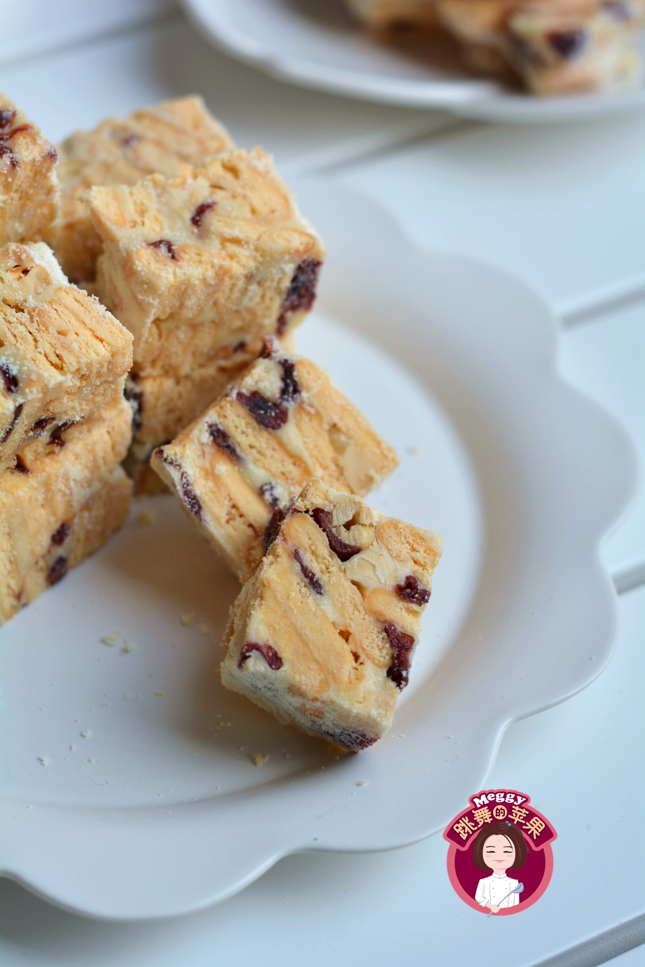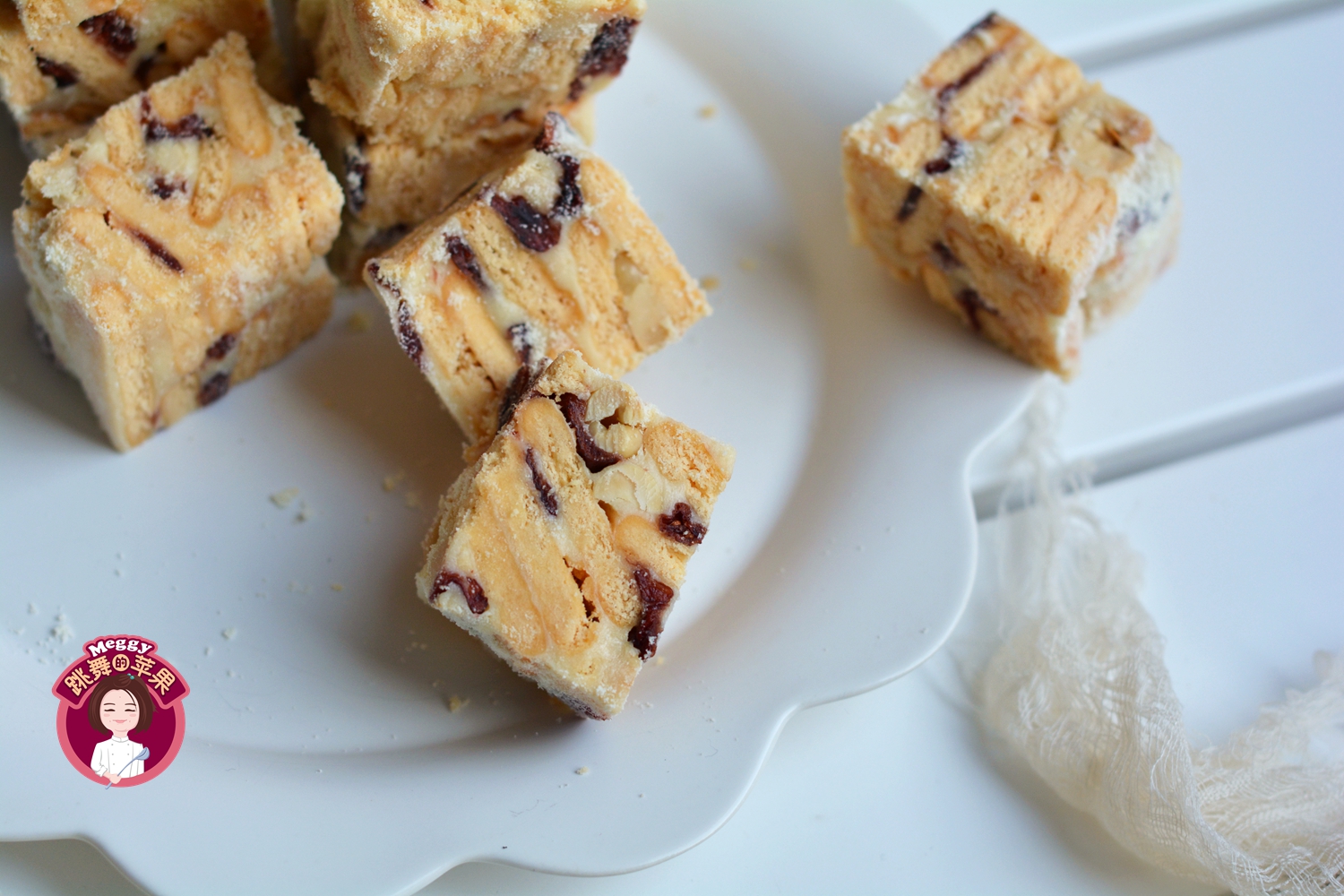材料:棉花糖150克,黄油40克,蔓越莓干60克,去皮熟花生米60克,酥脆饼干180克,奶粉45克(不含表面撒的)