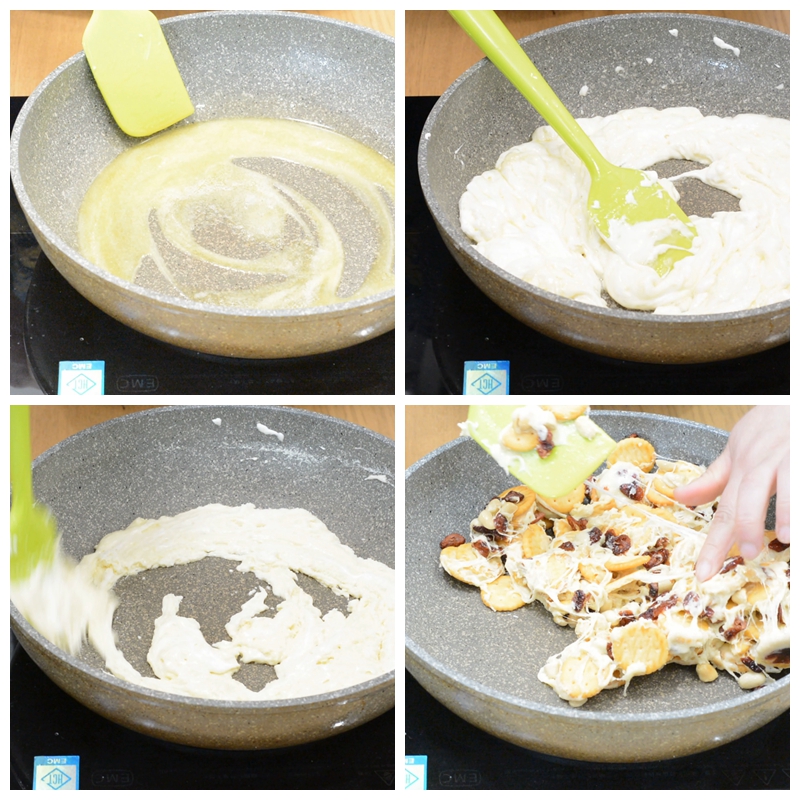 6. 将倒饼干果干倒入锅中,不停翻拌,直到均匀混合在一起,可用手指摸一下糖,不粘手就可以了;