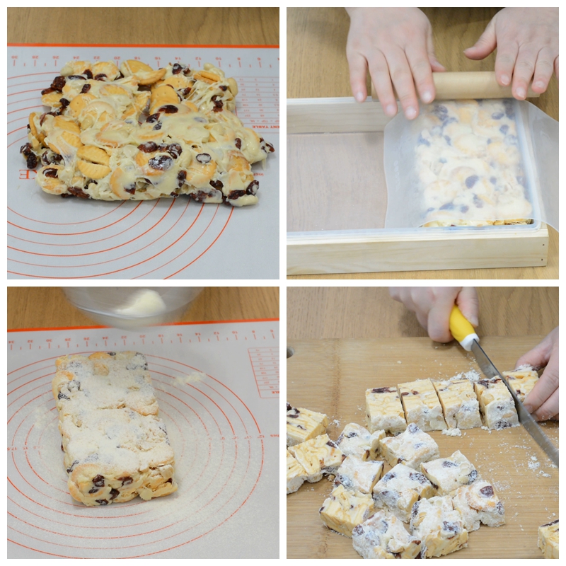8. 如果想要形状整齐,可以将糖团放进牛轧糖专用模具中,擀压成形,内部更加紧致;