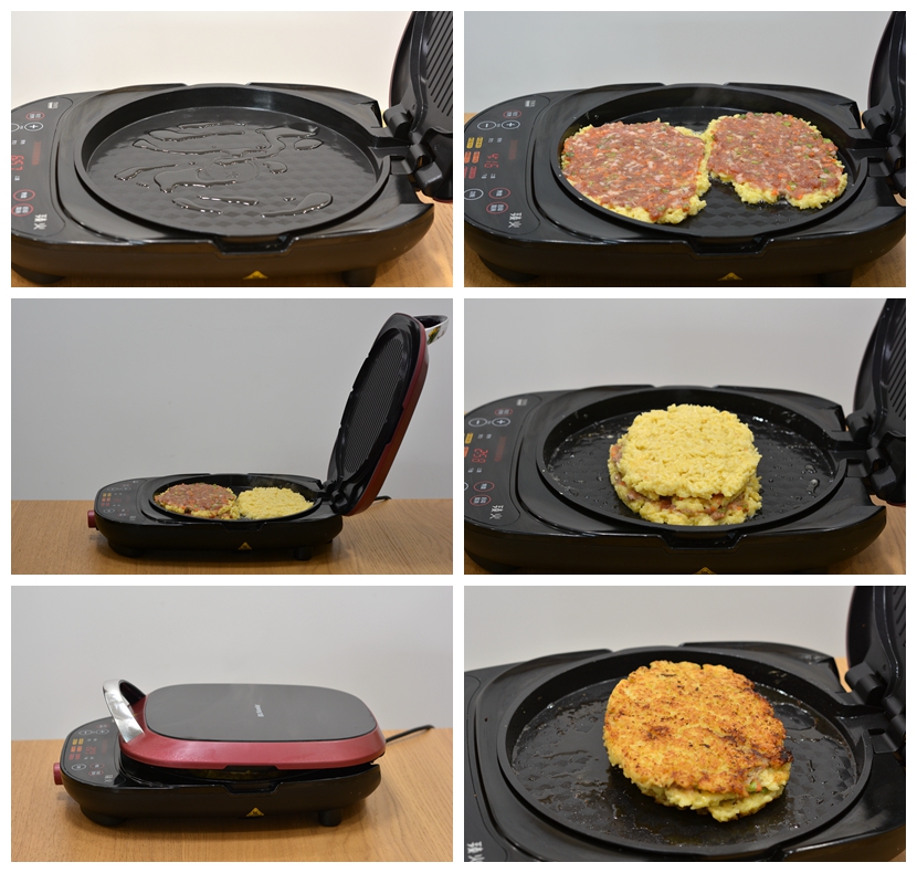 3. 用电饼铛能上下加热并合力将米饭肉饼压得瓷实一些,如果用平底锅就要用铲子按压饼,盖盖子煎烙才能让内部完全成熟。