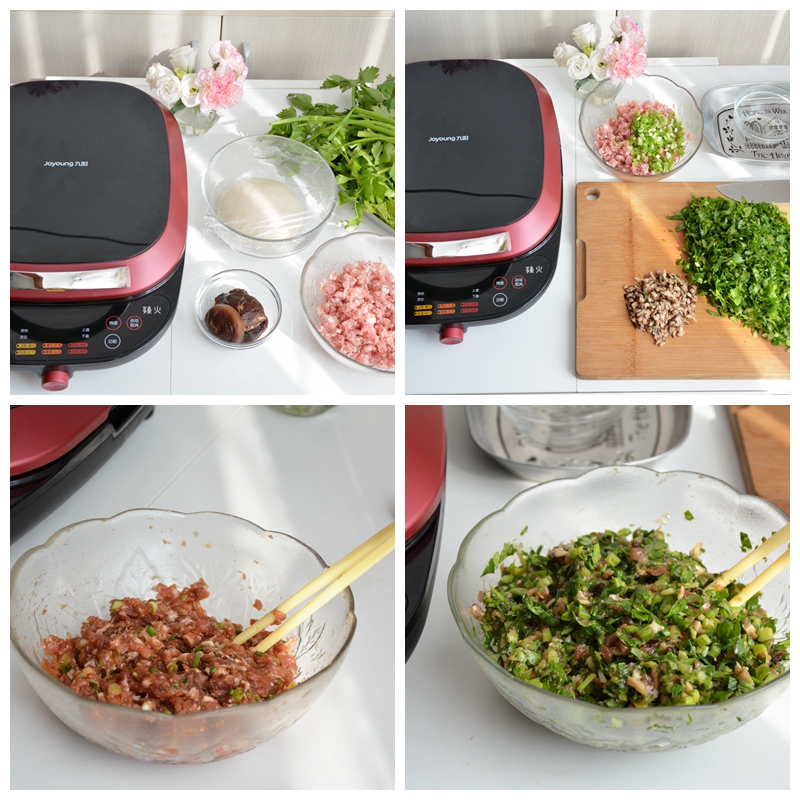 材料:芹菜叶1棵,香菇4朵,猪肉馅适量,油适量,蚝油20克,酱油10克,盐2克,黑胡椒粉2克,香葱4棵,柔软面团1块