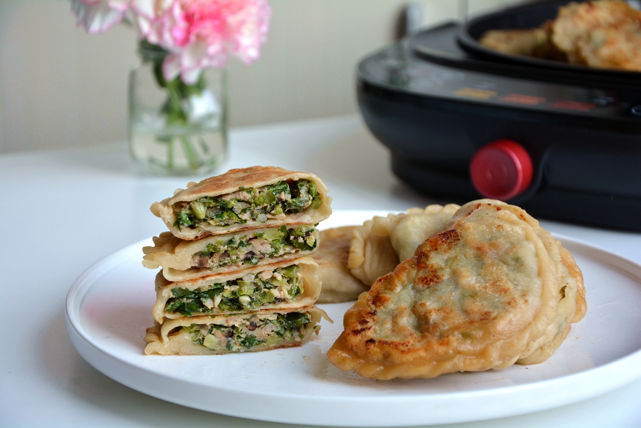 今天买了一棵大芹菜,绿油油的叶子惹人爱,正好还剩下几个泡好的香菇。从冰箱里取点肉馅,看,这薄皮大馅的饺子有10分钟就烙好了。用电饼铛可以上下加热,时间更快,虽然设定了12分钟,但实际用时只有10分钟。12个大合子,够两三个人吃一顿了。