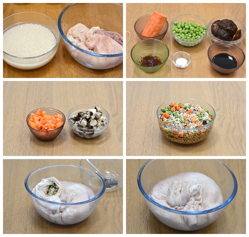 材料:猪肚1个,糯米250克,豌豆1小碗,胡萝卜半根,泡发香菇6朵,盐3克,酱油30克,蚝油15克,小绳2根