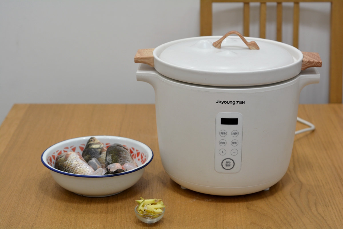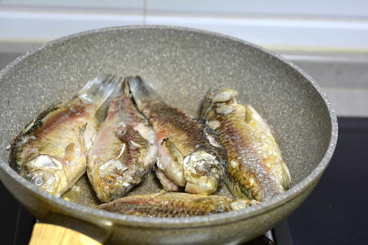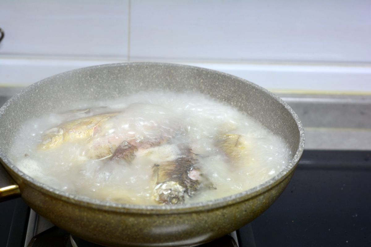 材料:鲫鱼5条,油适量,盐少许,姜1块,热水适量