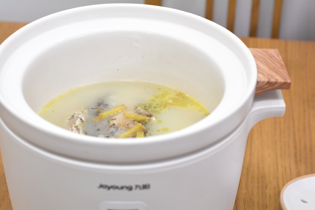 时间到,浓白鲜香的鲫鱼汤就做好了,根据口味撒盐,撒香葱末或者香菜增色添香;白胡椒粉也可以随喜欢加一点儿。