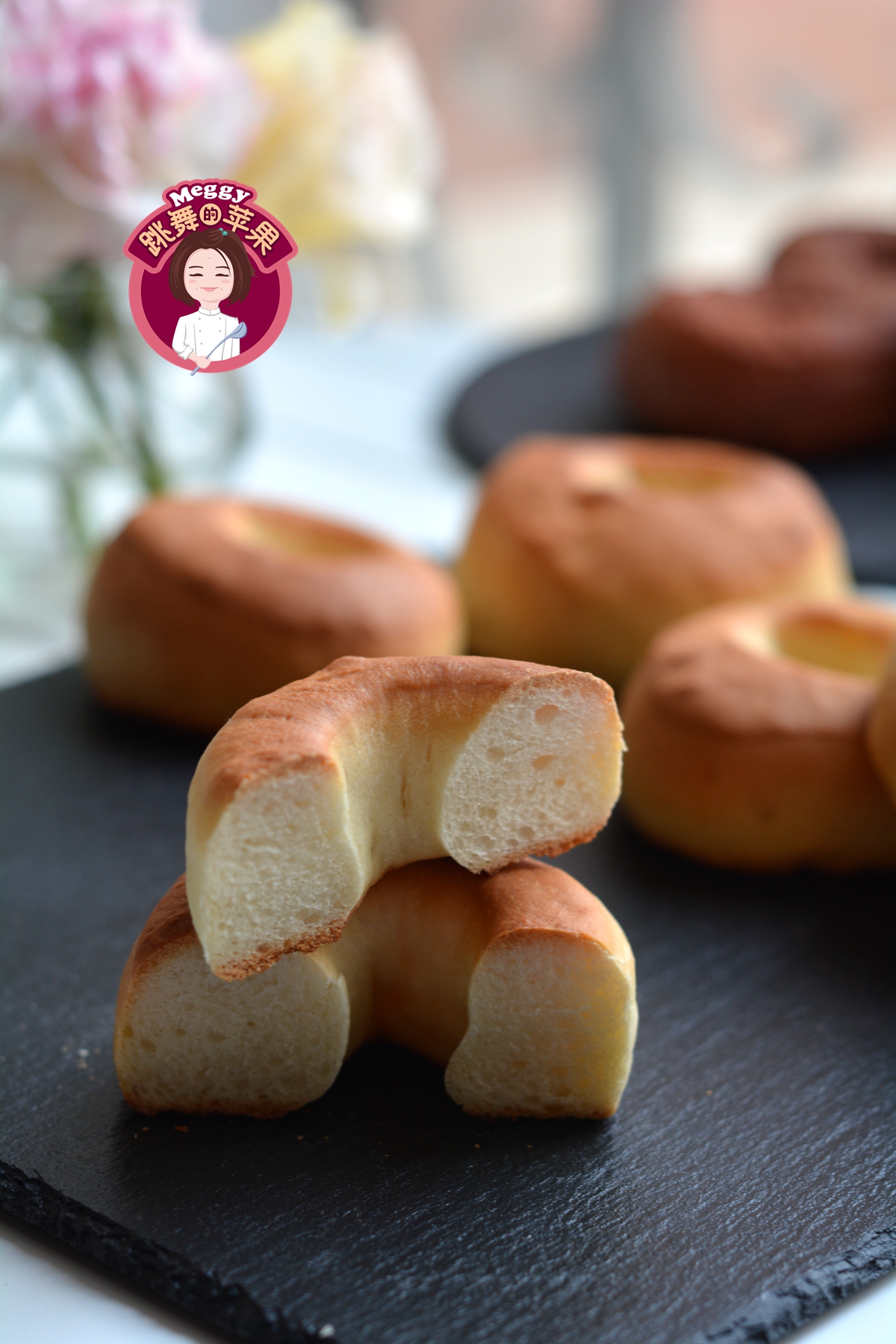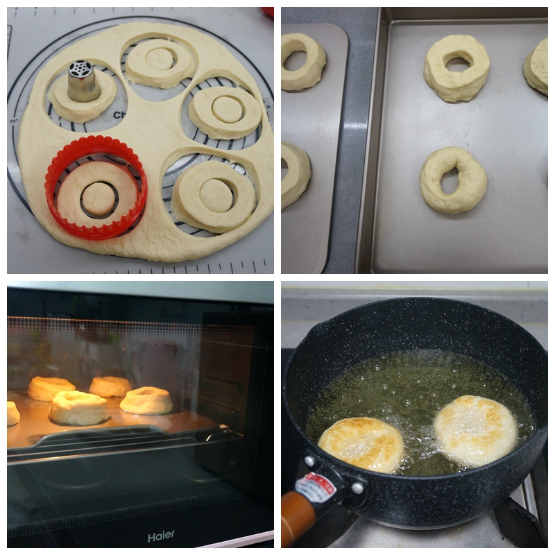 不管是炸的还是烤的,可以直接吃坯子,也可以用黑白巧和彩糖做装饰,更符合甜甜圈的名字;烤的甜甜圈坯子形状不够圆润,但口感外酥里嫩;炸的甜甜圈坯子外表圆润,但要中火来炸(7、8成热),否则容易外糊而内生。