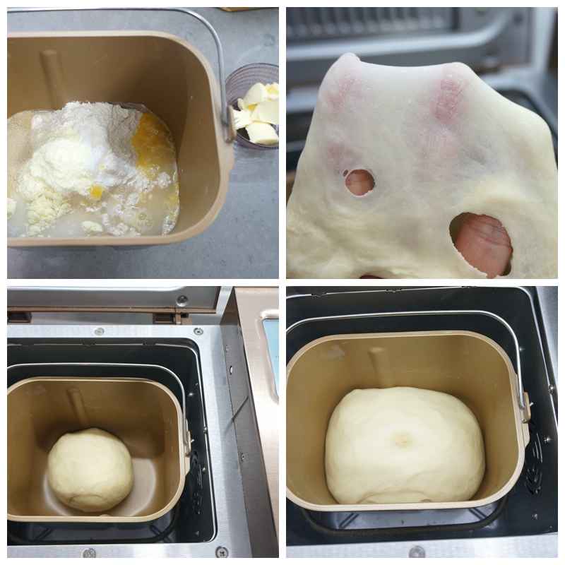 材料:高筋面粉250克,白糖30克,奶粉10克,鸡蛋30克,黄油 25克,水120克,酵母3克,盐2克