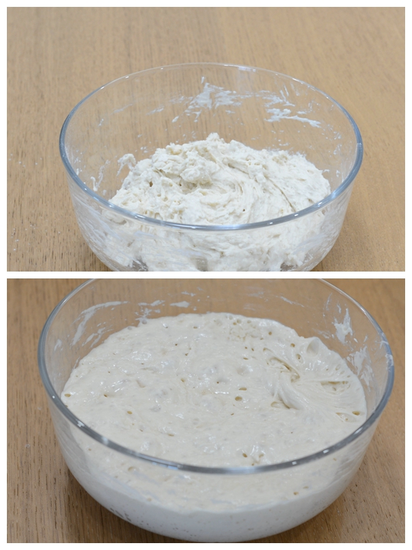 2. 面团是原来的2倍大时,掀起面团,呈细长的拉丝,中种面团发酵成功;