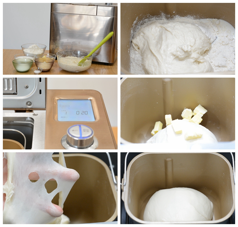 6. 待揉面10分钟时,面团成型且能拉出粗膜时,加入软化的黄油,继续完成剩下的10分钟,然后再设一个揉面程序约15分钟左右;