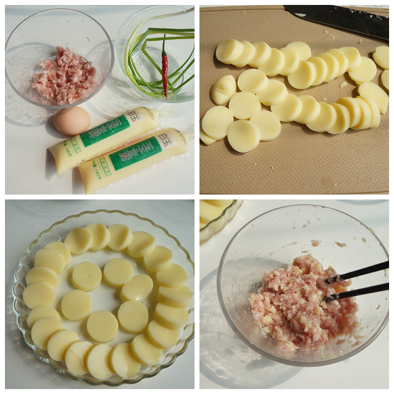4. 豆腐边角料打入肉馅中,加盐、凉水,打成糊糊状,还可以放些葱花、姜末或者胡椒粉;